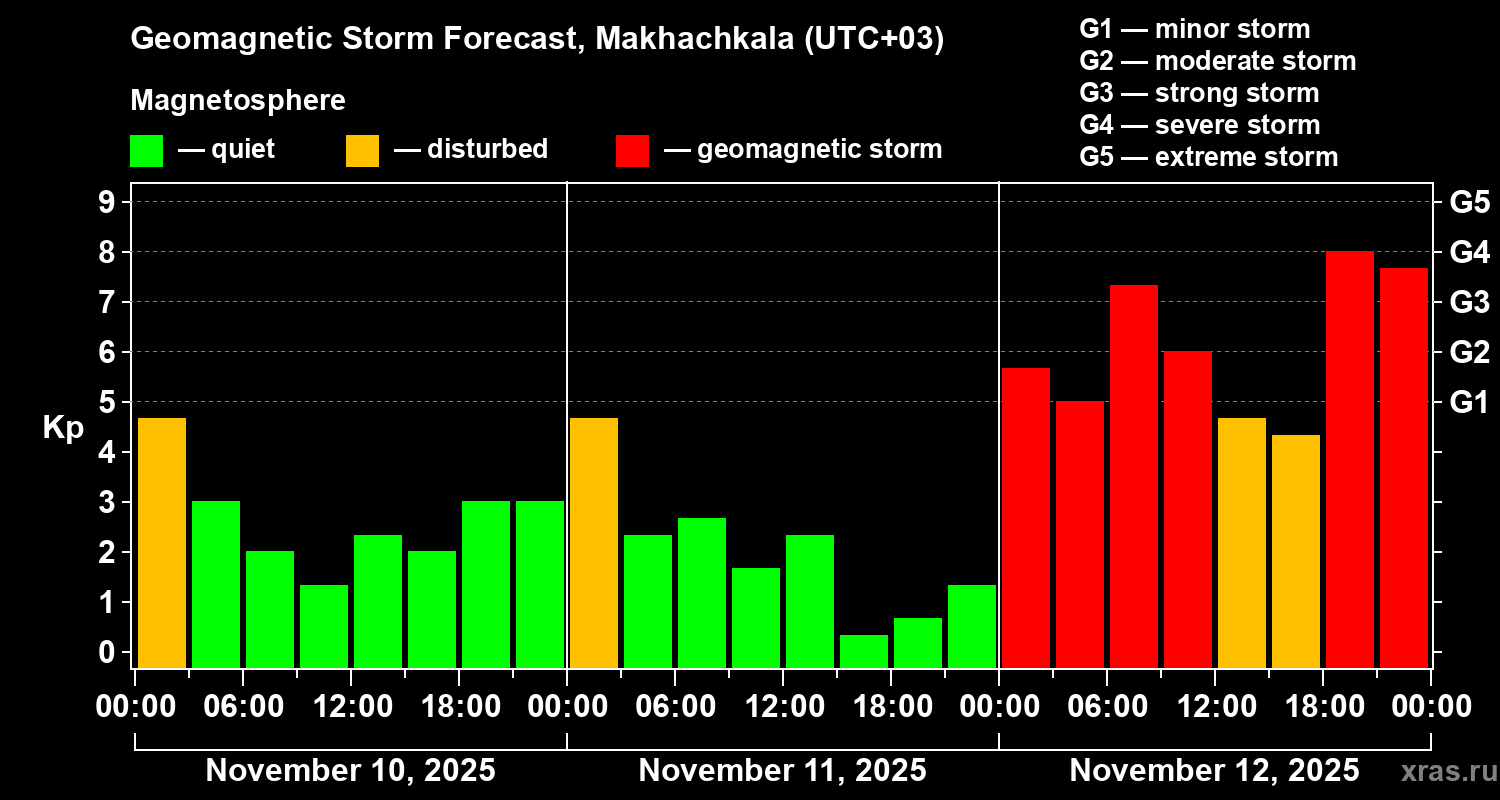 Geomagnetic storm forecast in Makhachkala for Nov 10, 2025