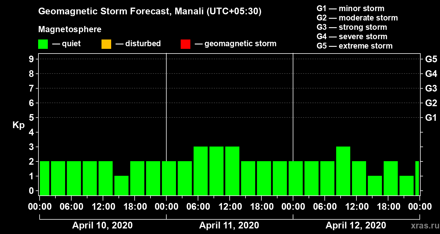 Geomagnetic storm forecast in Manali for Apr 10, 2020