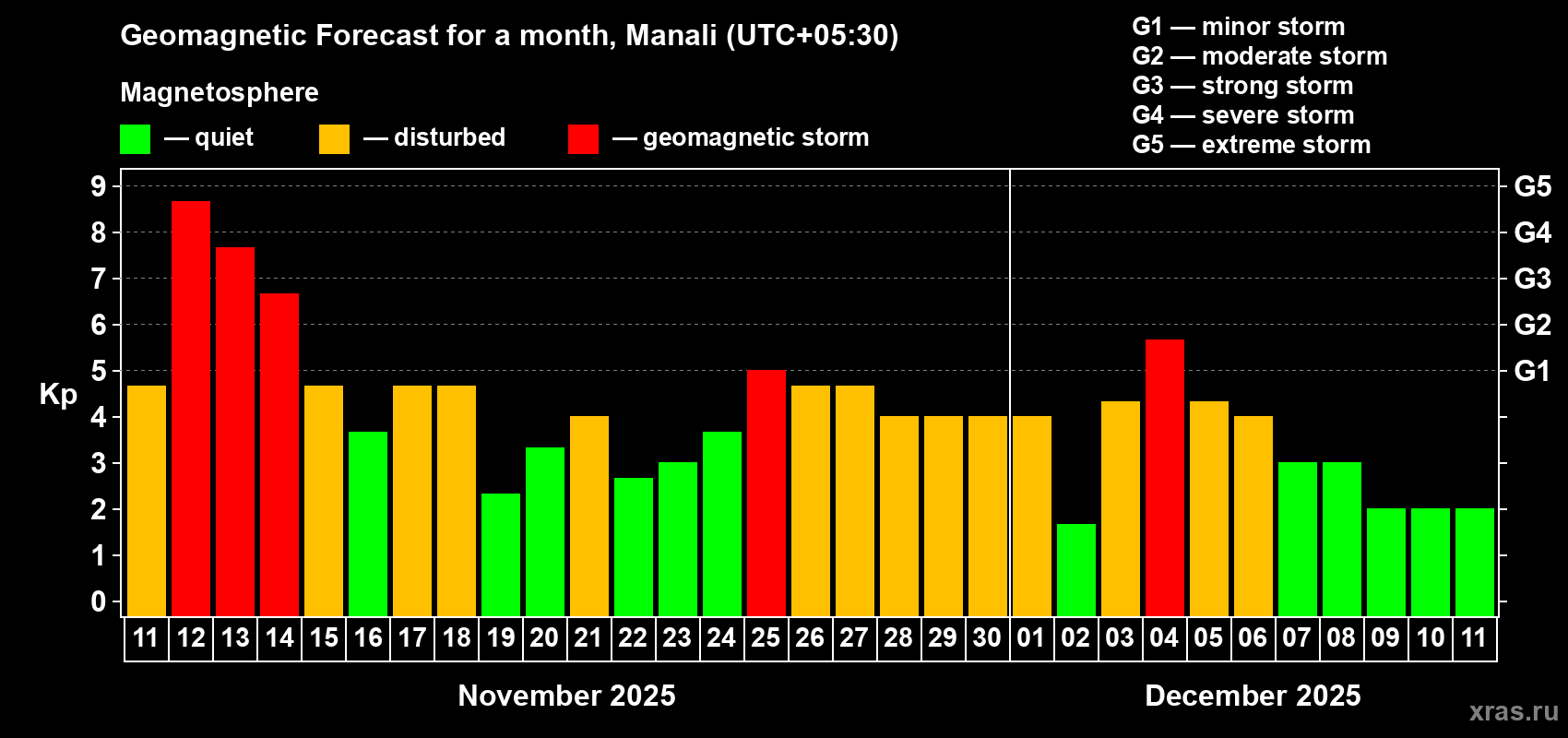 Geomagnetic storm forecast in Manali for Nov 11, 2025