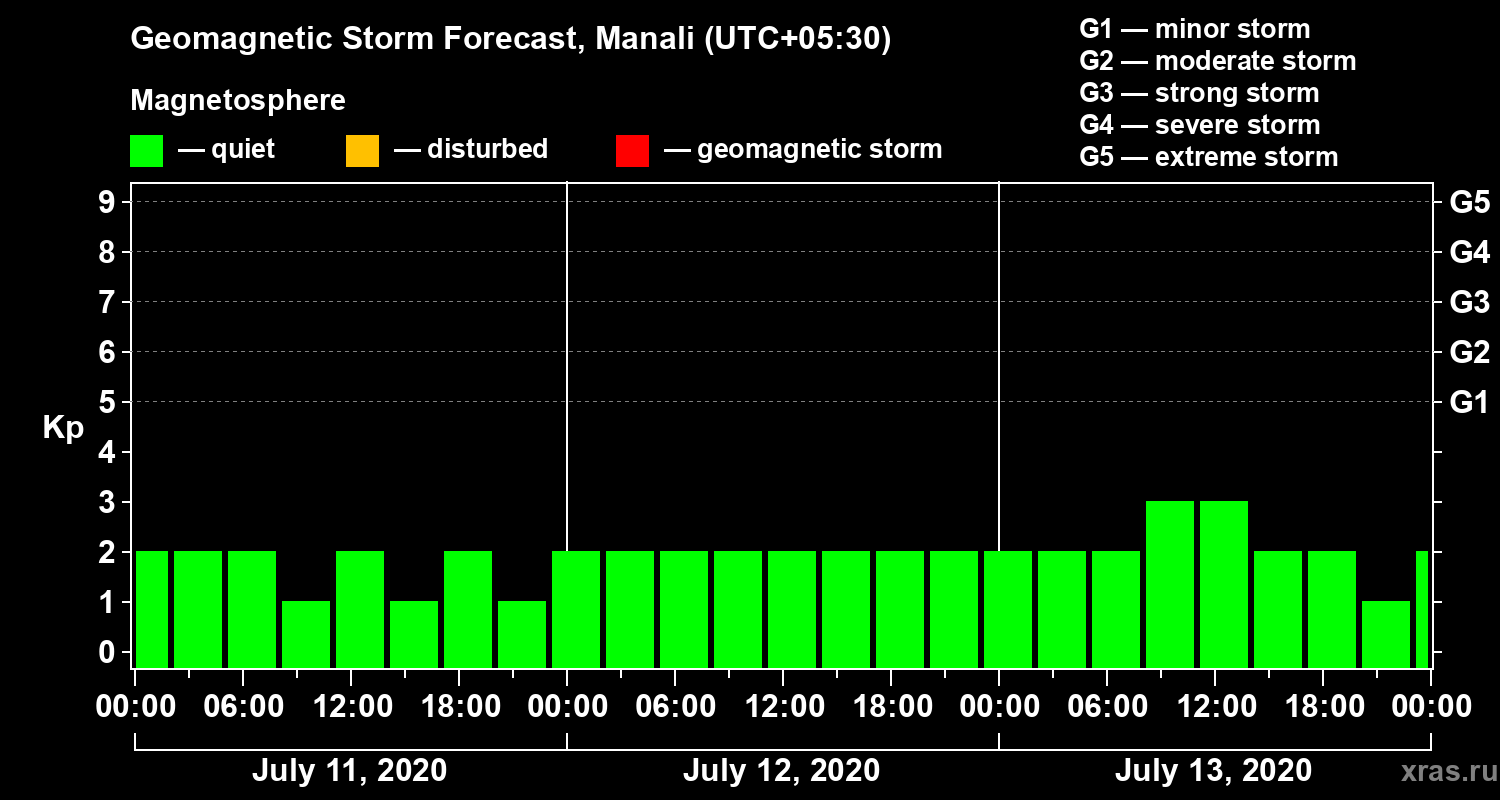 Geomagnetic storm forecast in Manali for Jul 11, 2020