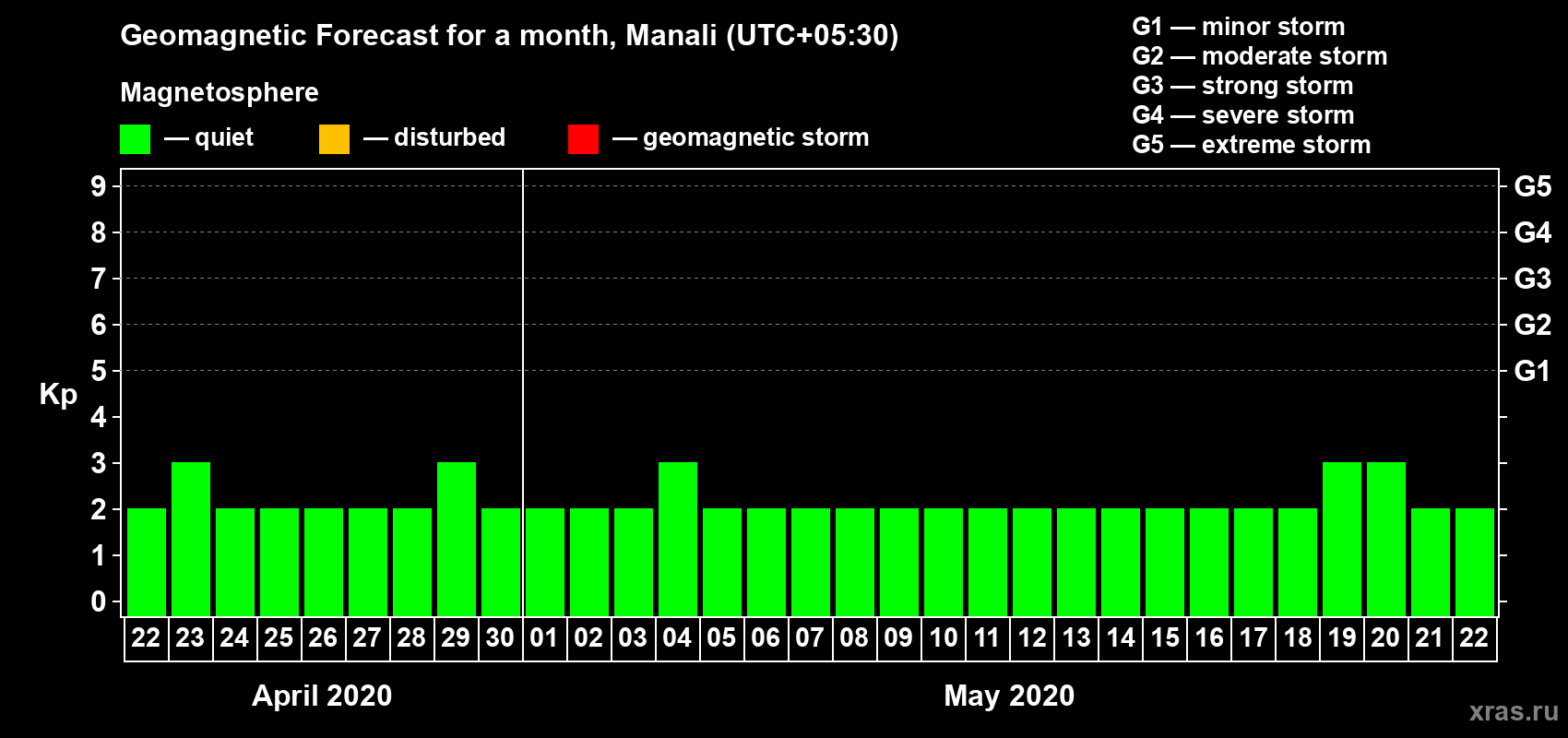 Geomagnetic storm forecast in Manali for Apr 22, 2020