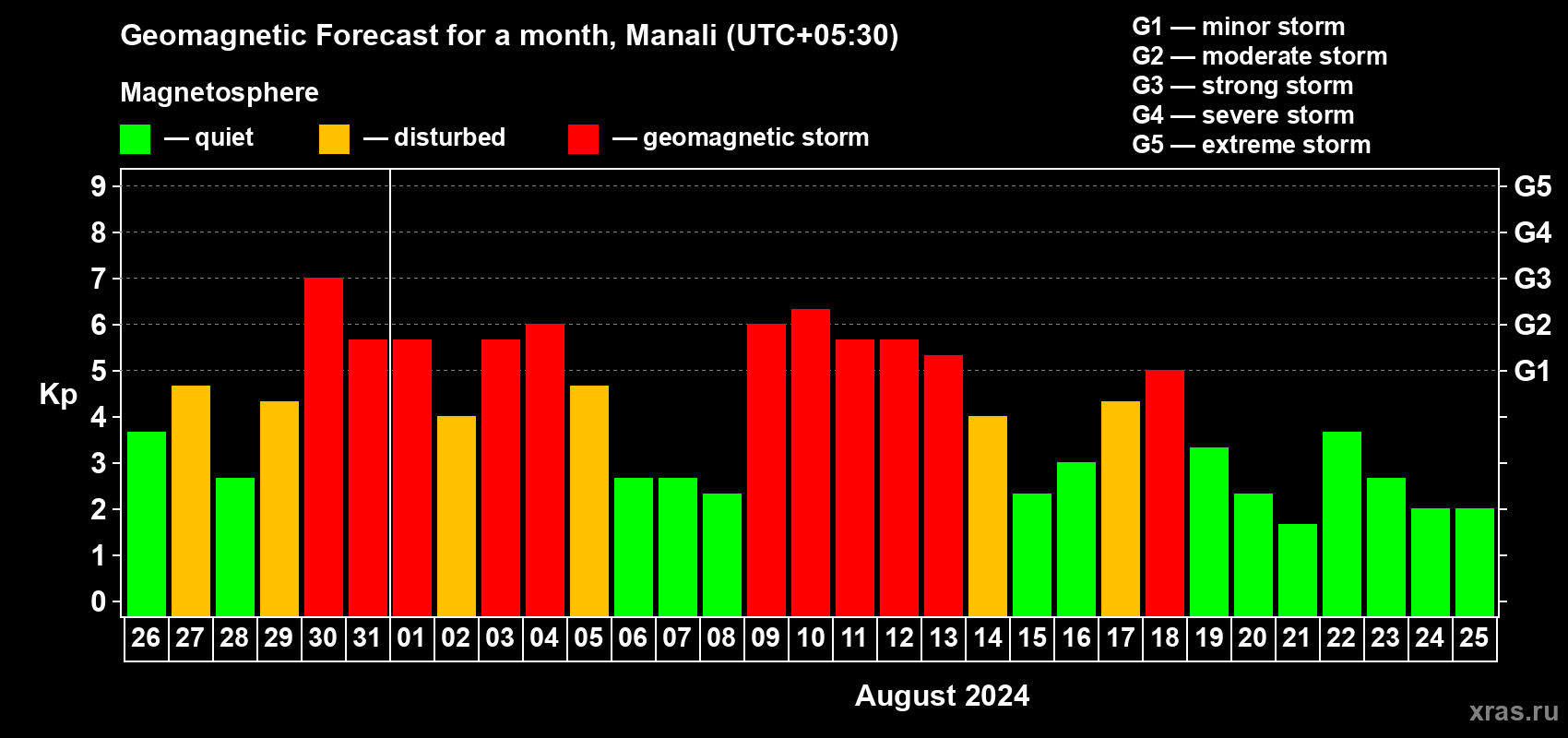 Geomagnetic storm forecast in Manali for Jul 26, 2024