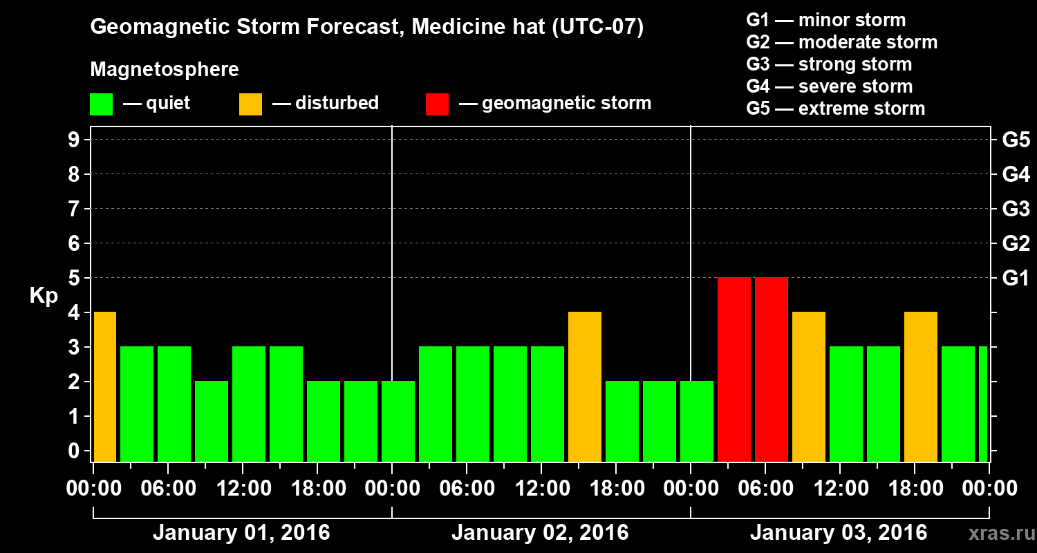 Geomagnetic storm forecast in Medicine hat for Jan 01, 2016