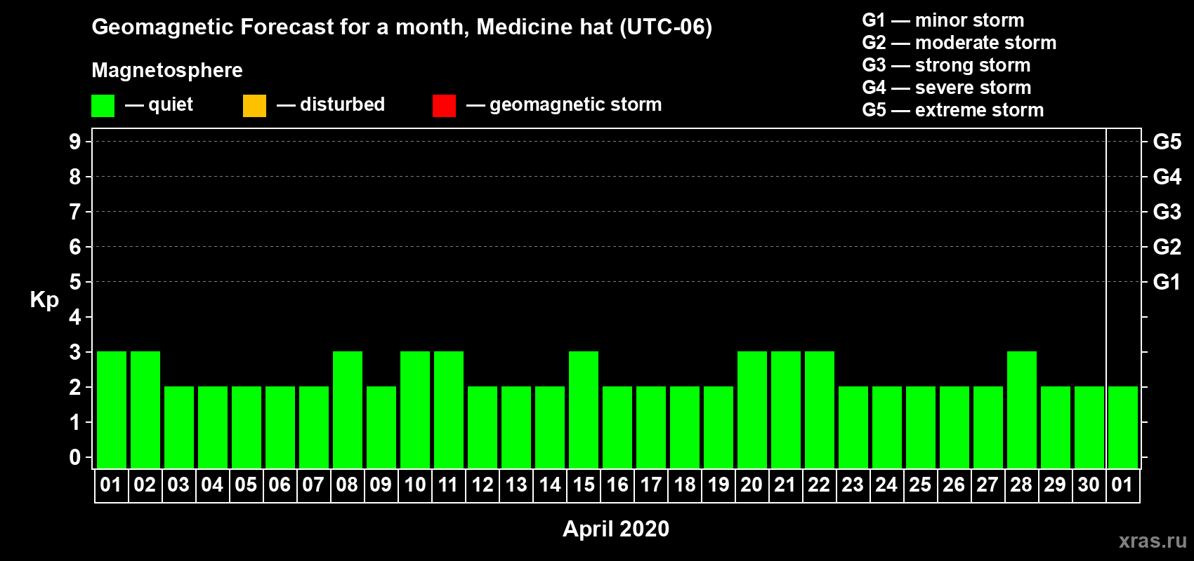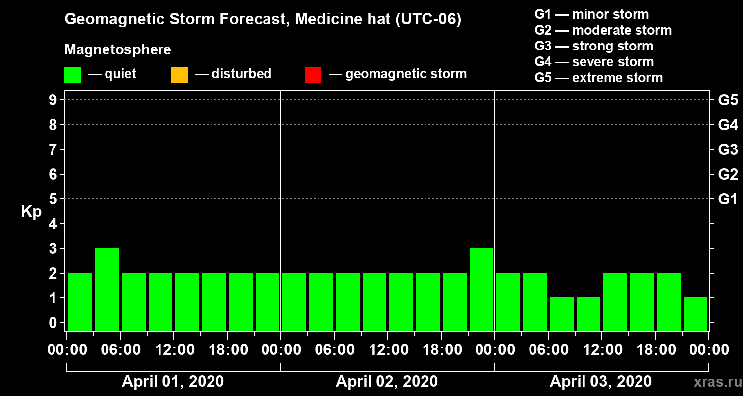 Geomagnetic storm forecast in Medicine hat for Apr 01, 2020