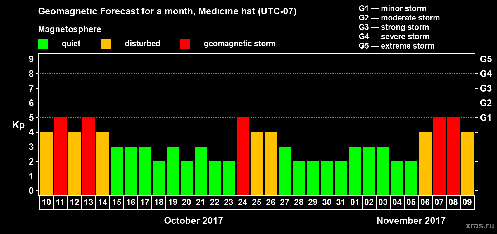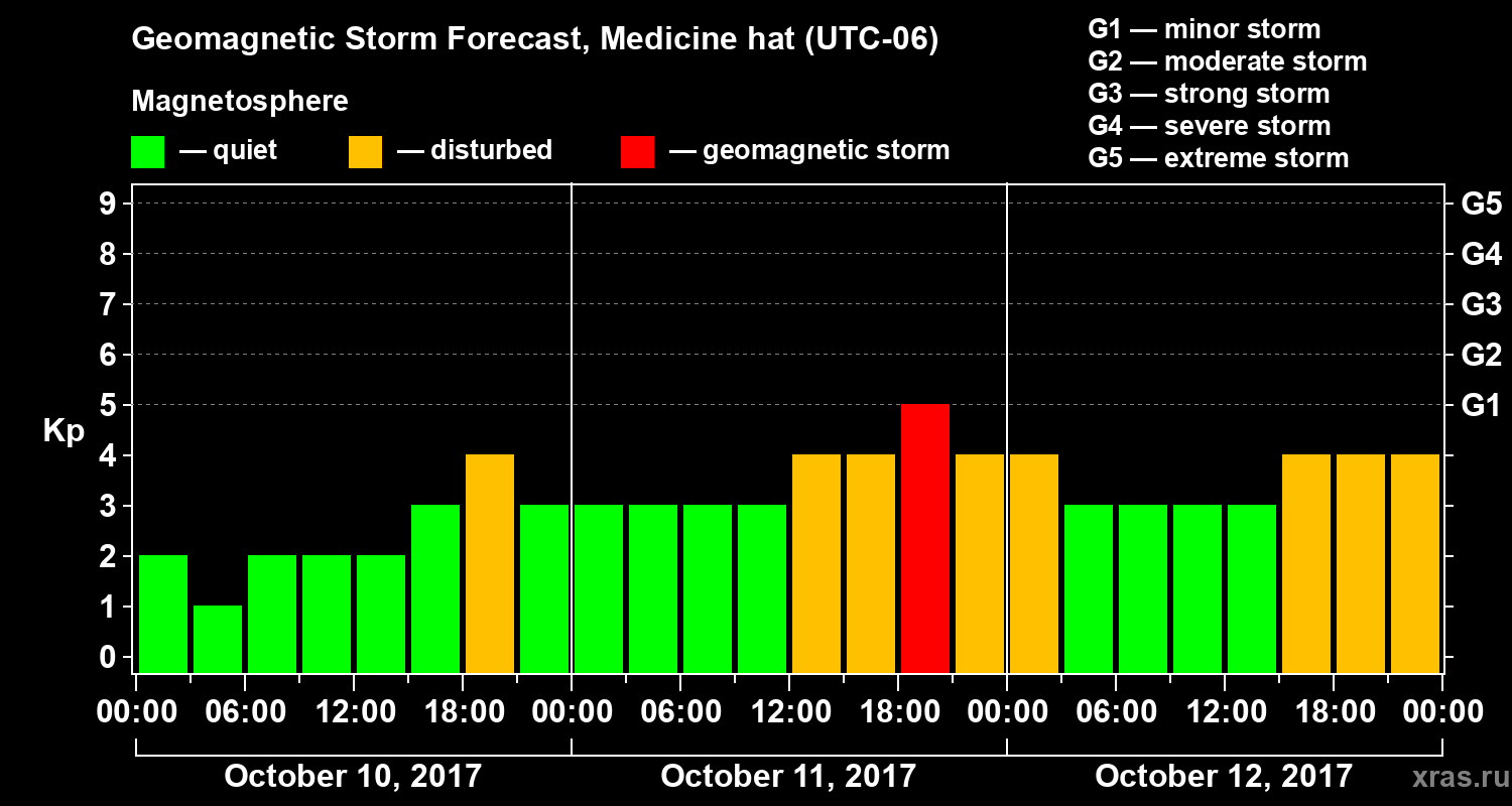 Geomagnetic storm forecast in Medicine hat for Oct 10, 2017