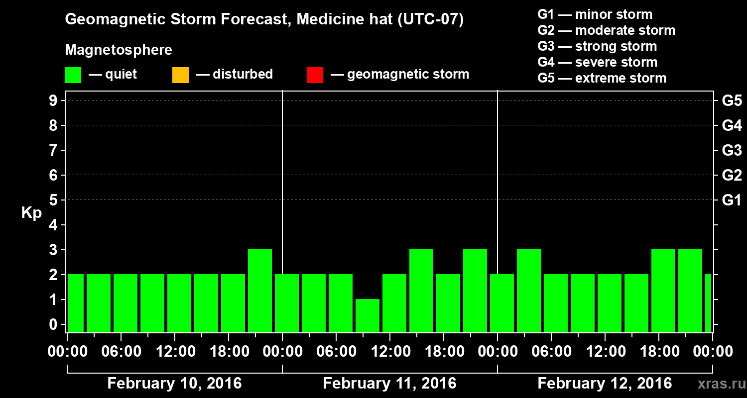 Geomagnetic storm forecast in Medicine hat for Feb 10, 2016