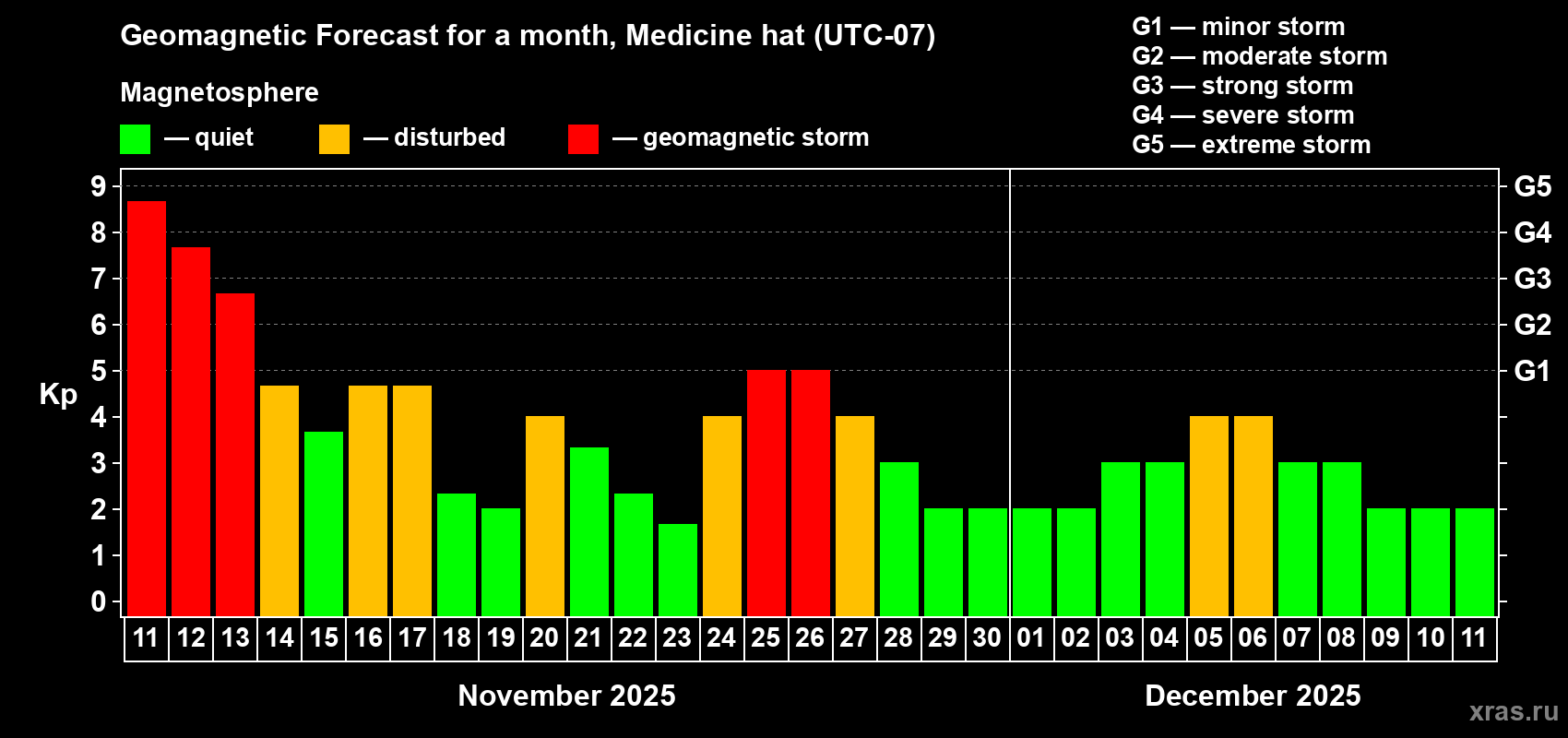 Geomagnetic storm forecast in Medicine hat for Nov 11, 2025