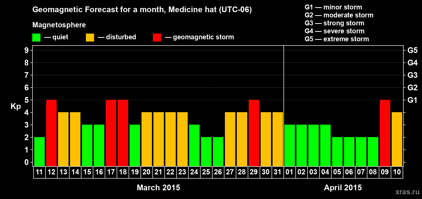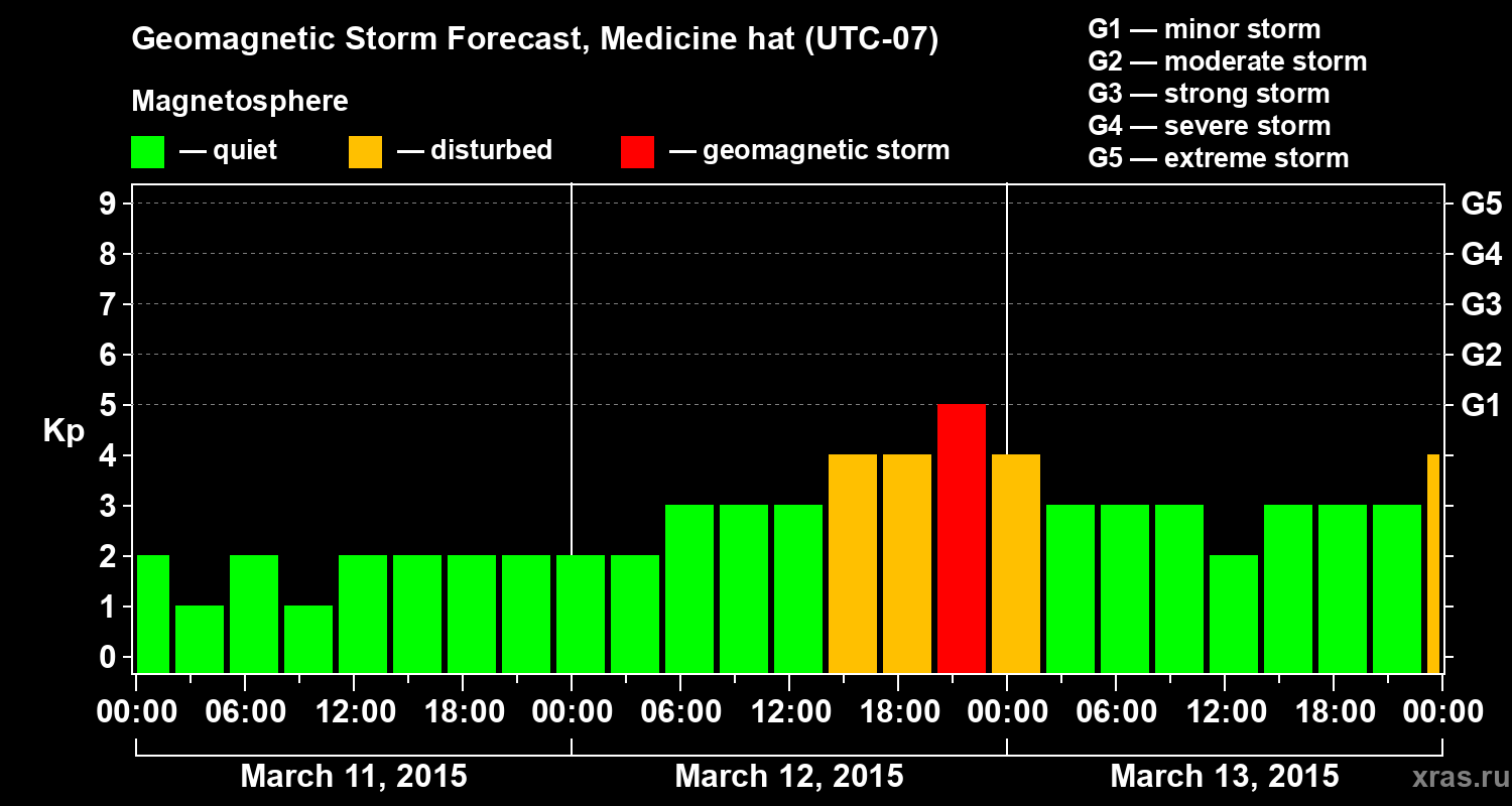 Geomagnetic storm forecast in Medicine hat for Mar 11, 2015