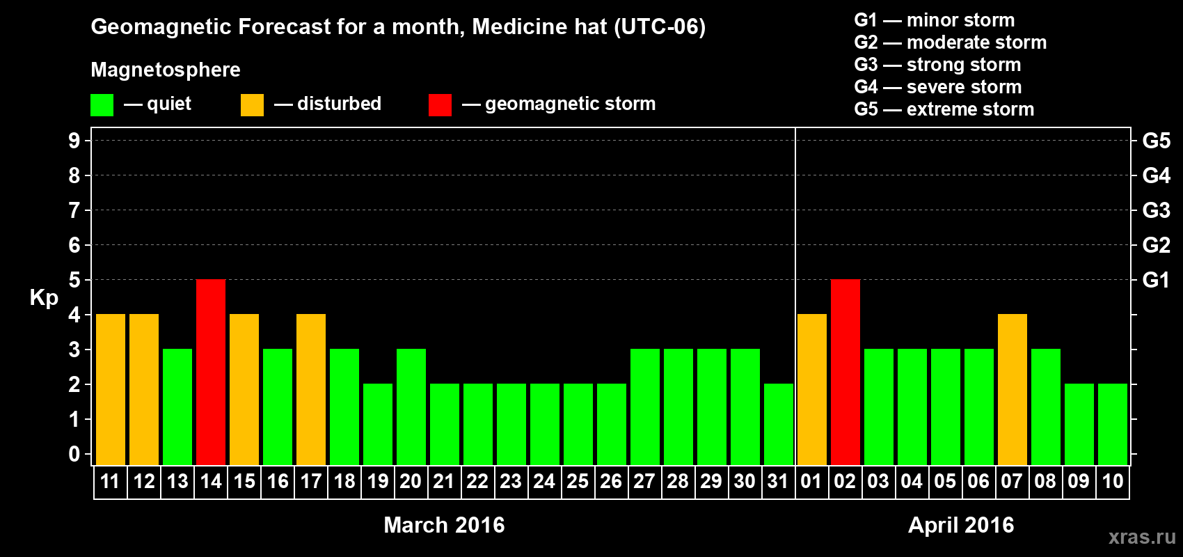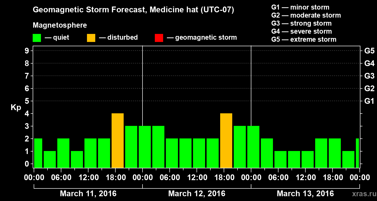 Geomagnetic storm forecast in Medicine hat for Mar 11, 2016