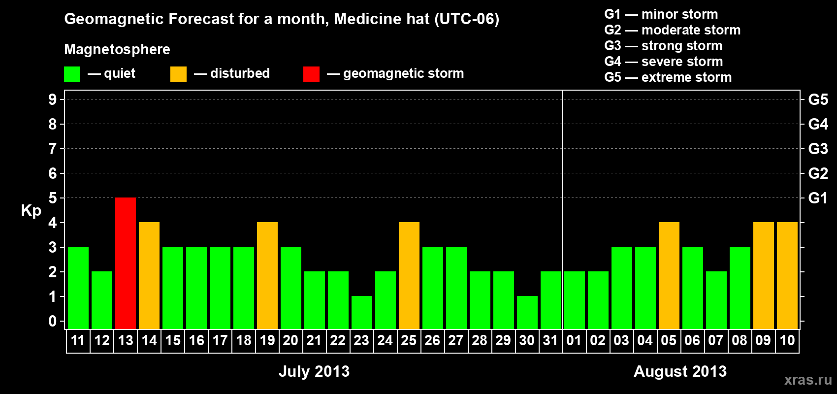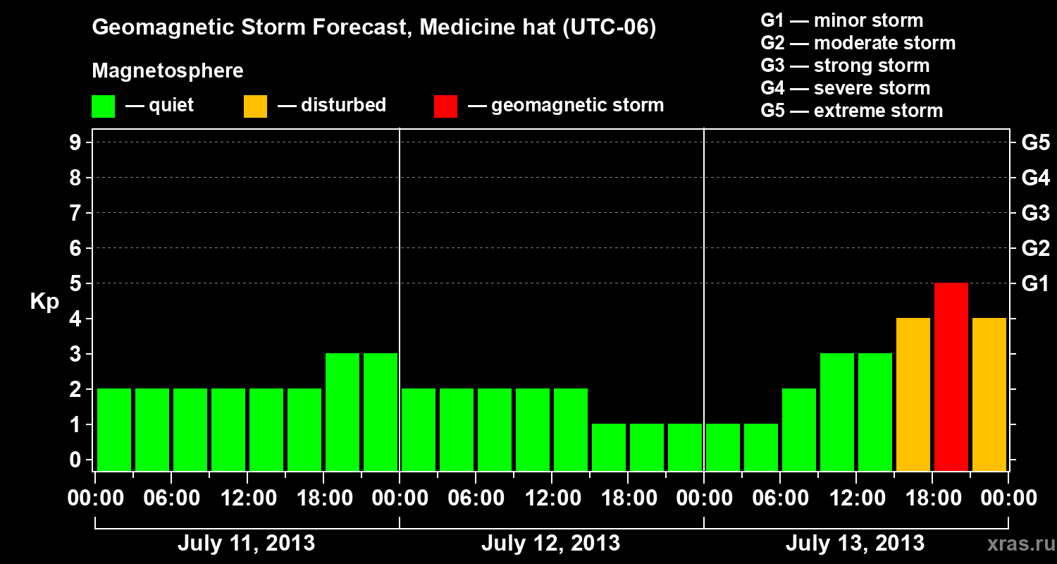 Geomagnetic storm forecast in Medicine hat for Jul 11, 2013