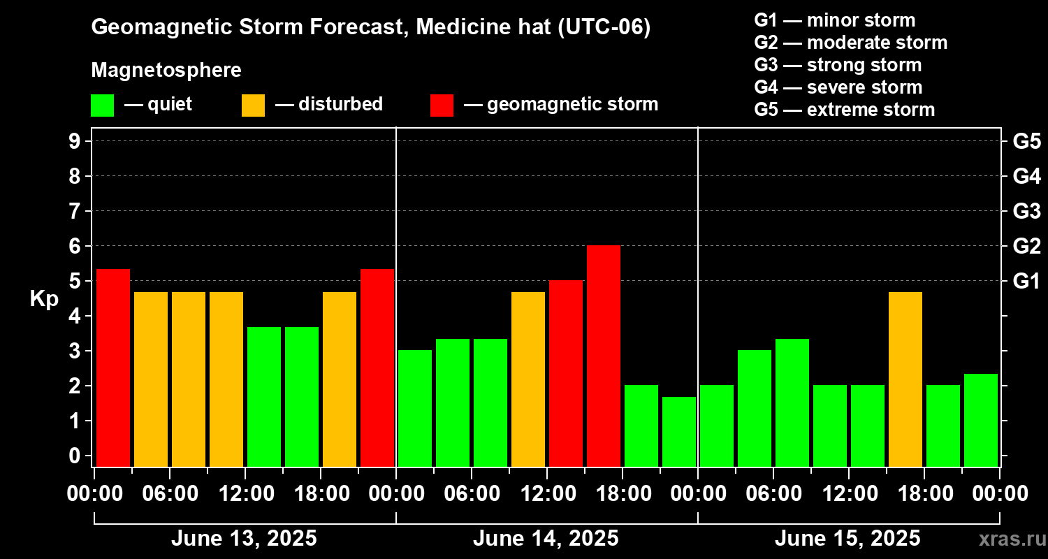 Geomagnetic storm forecast in Medicine hat for Jun 13, 2025