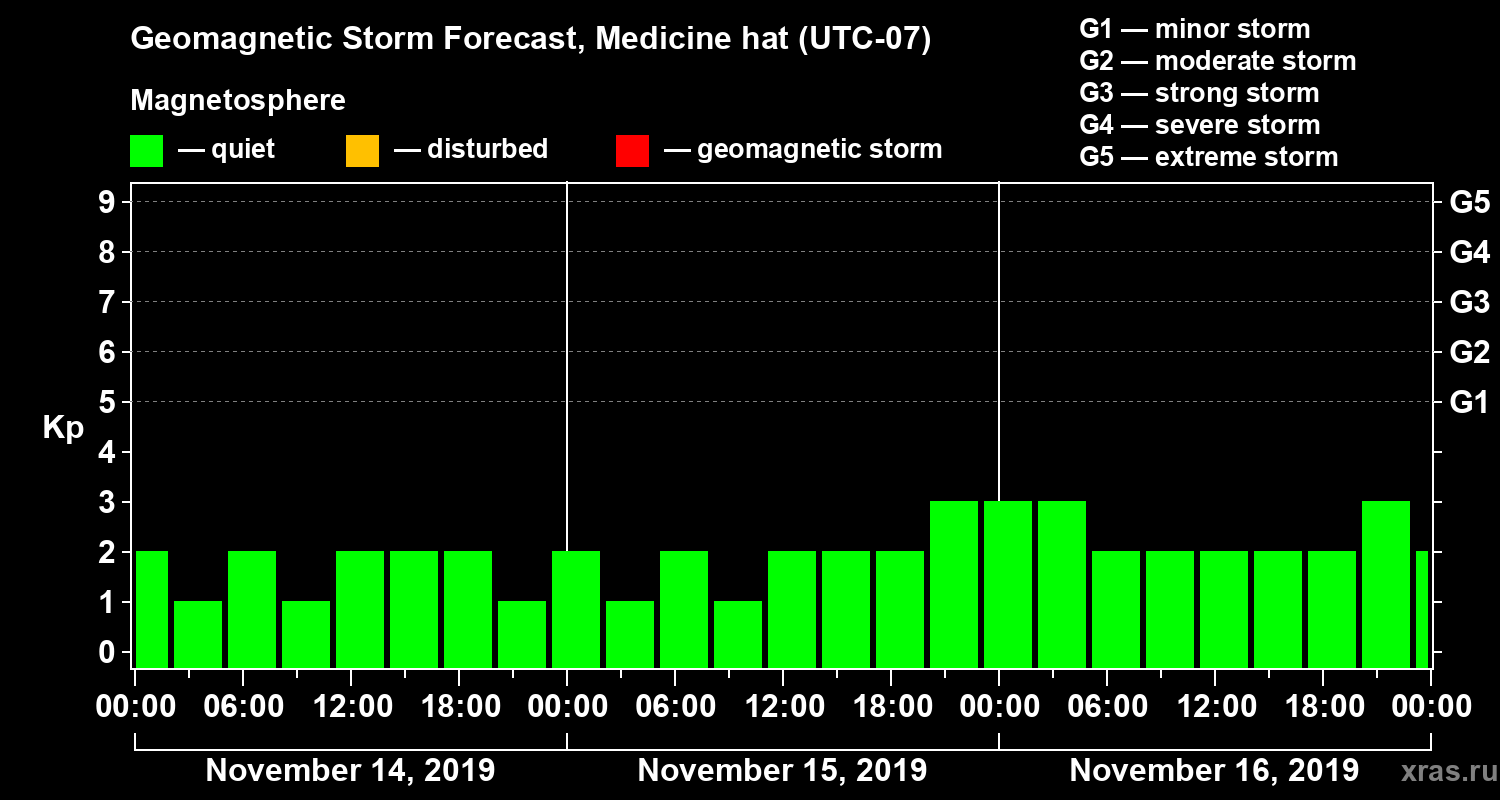 Geomagnetic storm forecast in Medicine hat for Nov 14, 2019