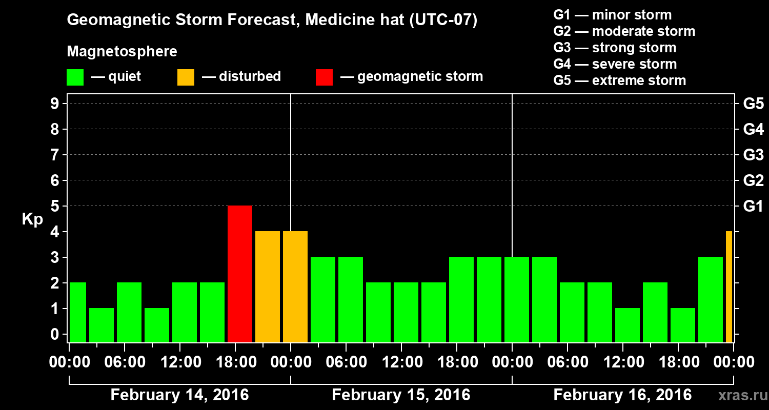 Geomagnetic storm forecast in Medicine hat for Feb 14, 2016