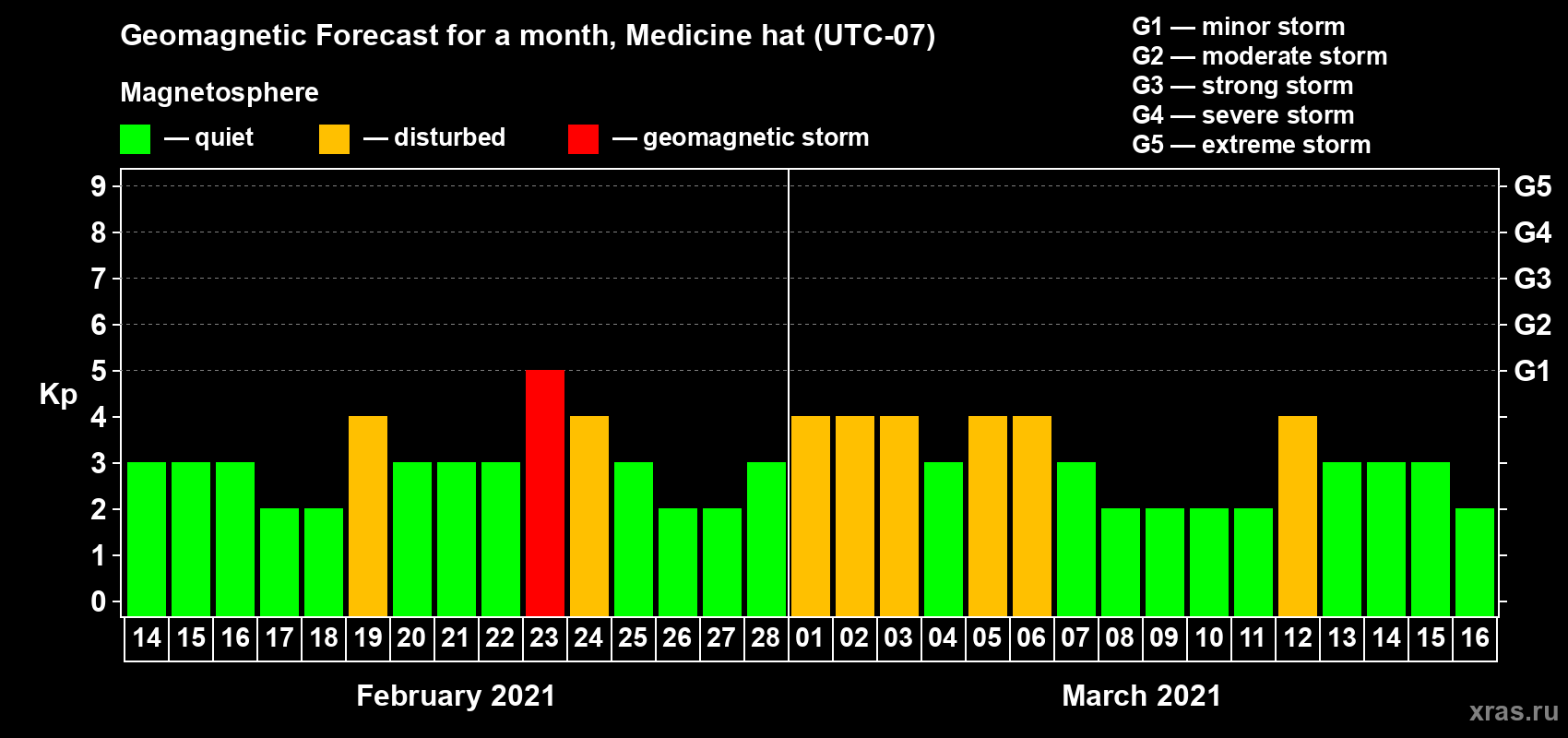 Geomagnetic storm forecast in Medicine hat for Feb 14, 2021