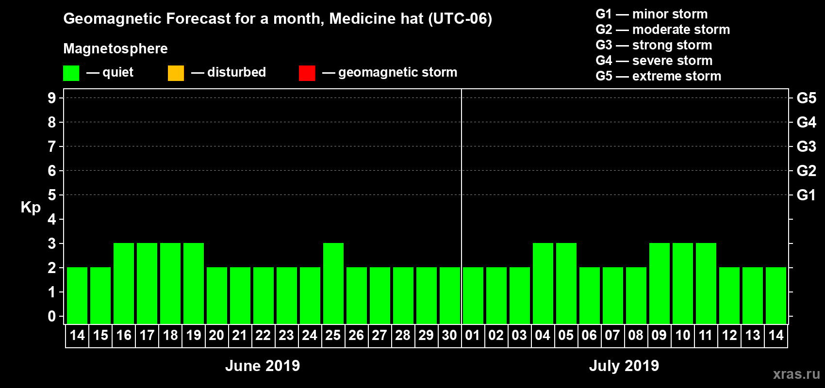 Geomagnetic storm forecast in Medicine hat for Jun 14, 2019