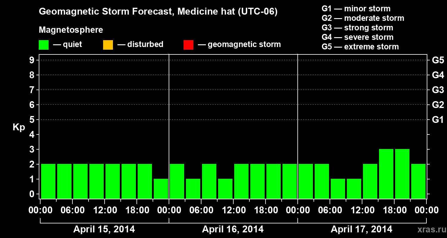 Geomagnetic storm forecast in Medicine hat for Apr 15, 2014
