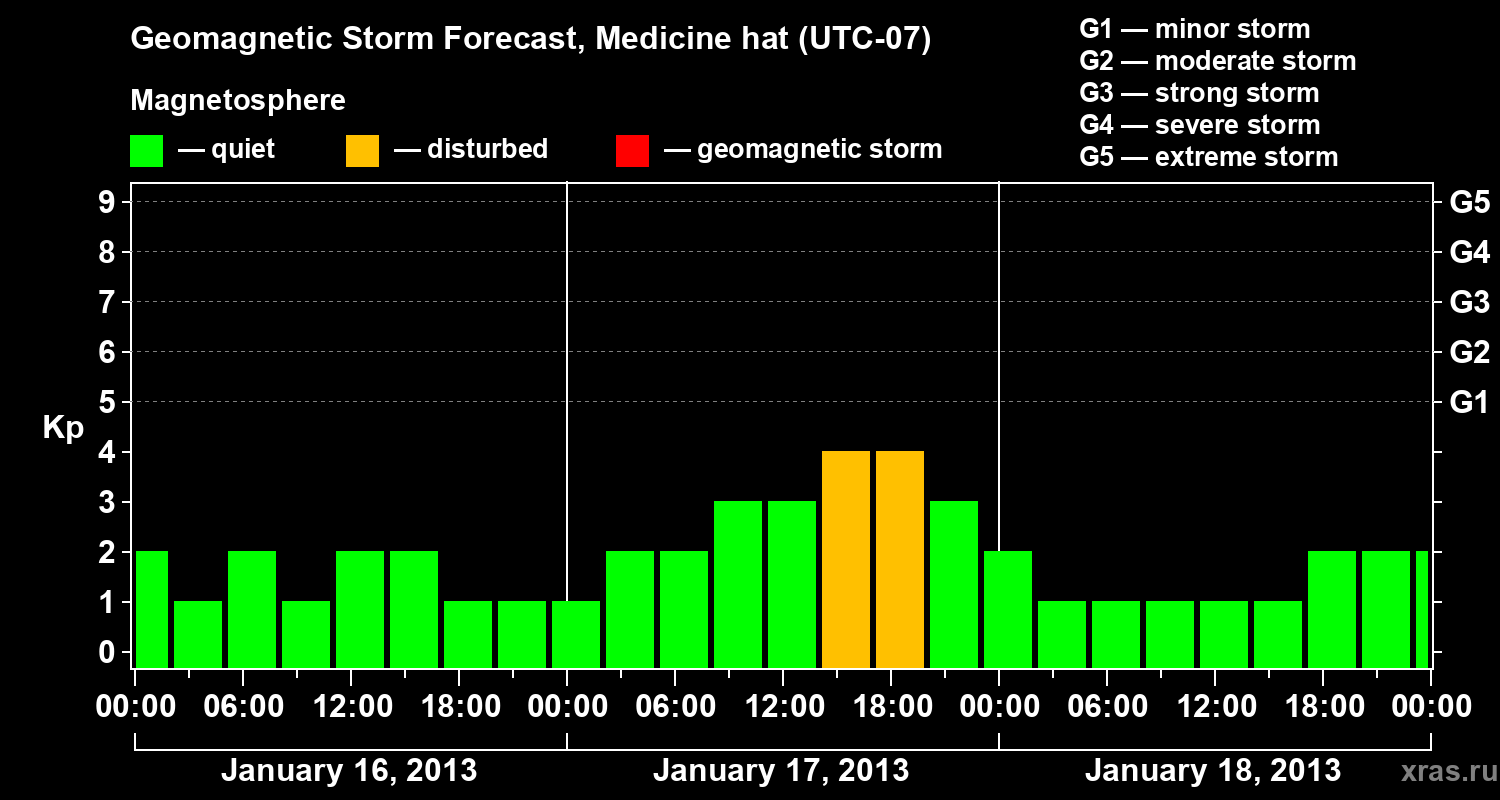 Geomagnetic storm forecast in Medicine hat for Jan 16, 2013