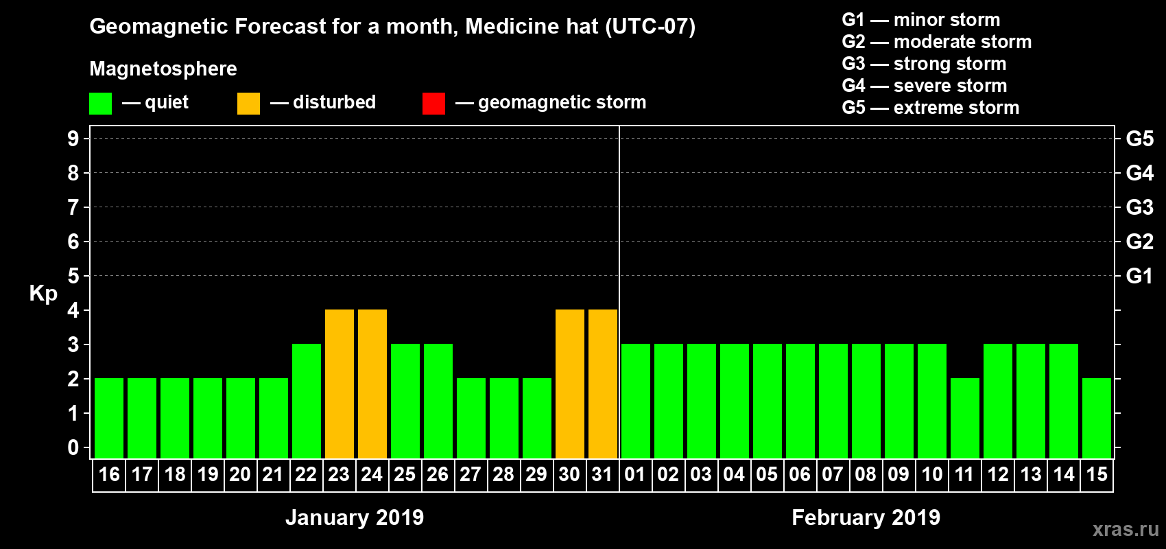 Geomagnetic storm forecast in Medicine hat for Jan 16, 2019