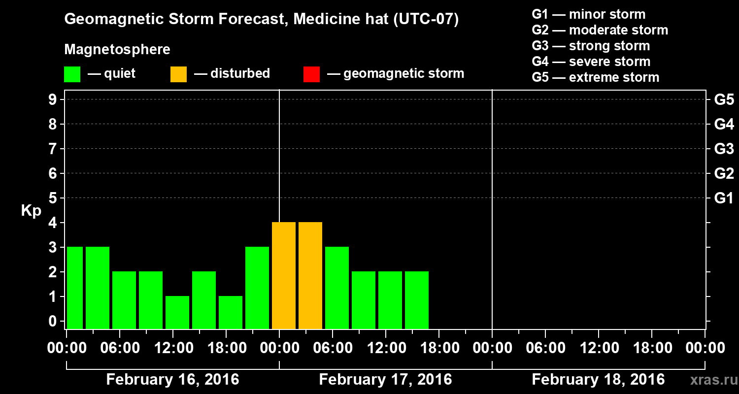 Geomagnetic storm forecast in Medicine hat for Feb 16, 2016