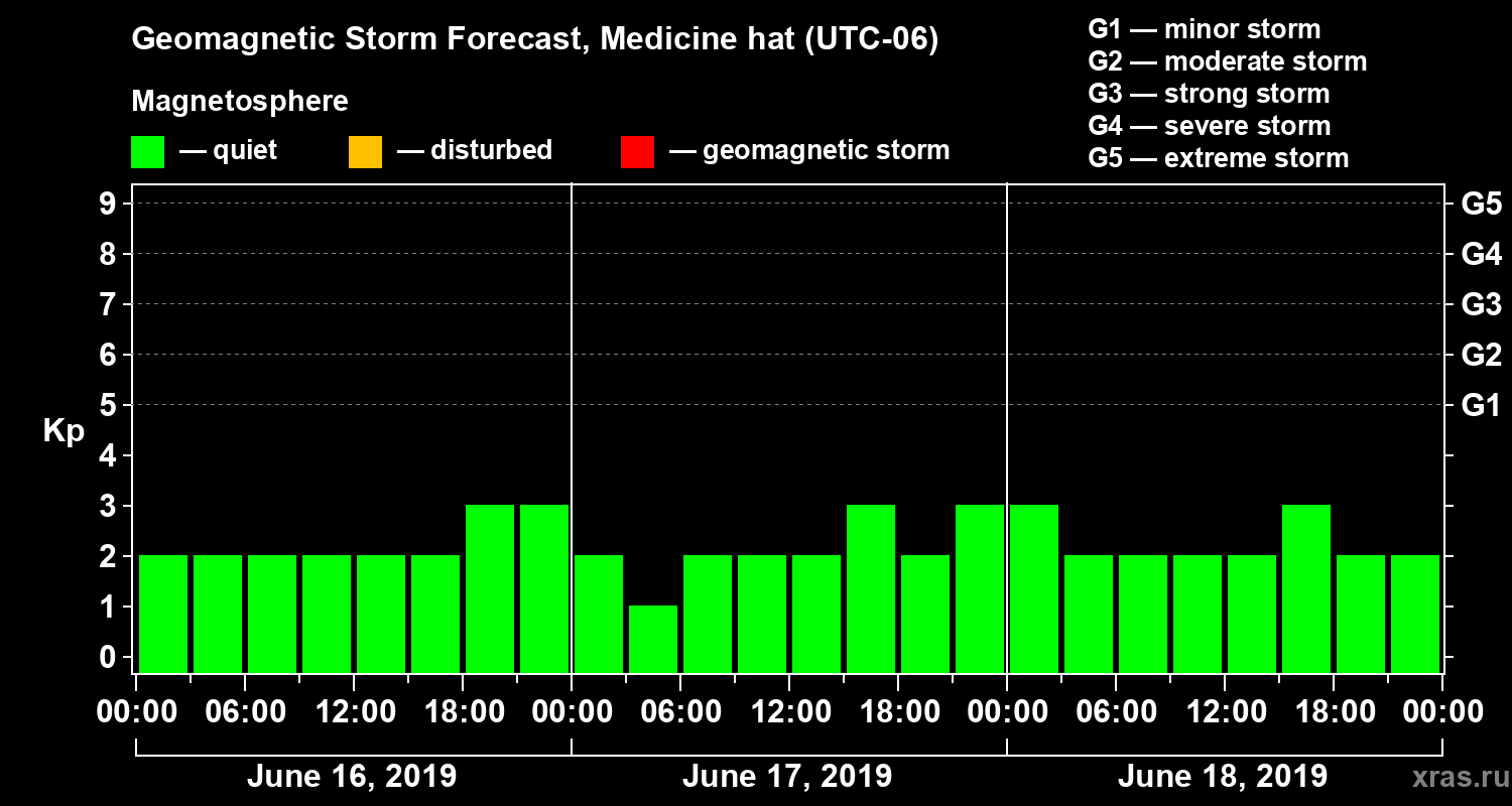 Geomagnetic storm forecast in Medicine hat for Jun 16, 2019