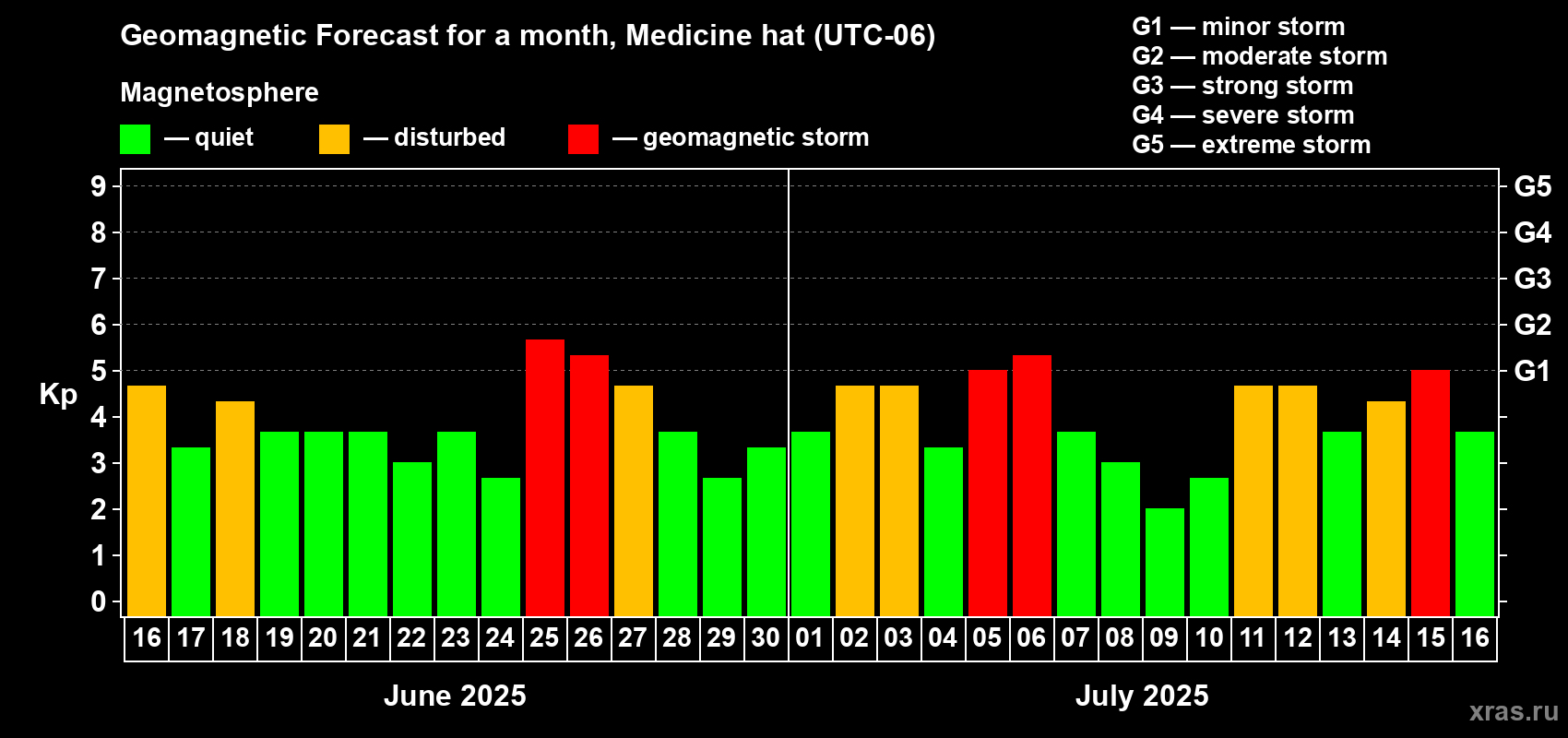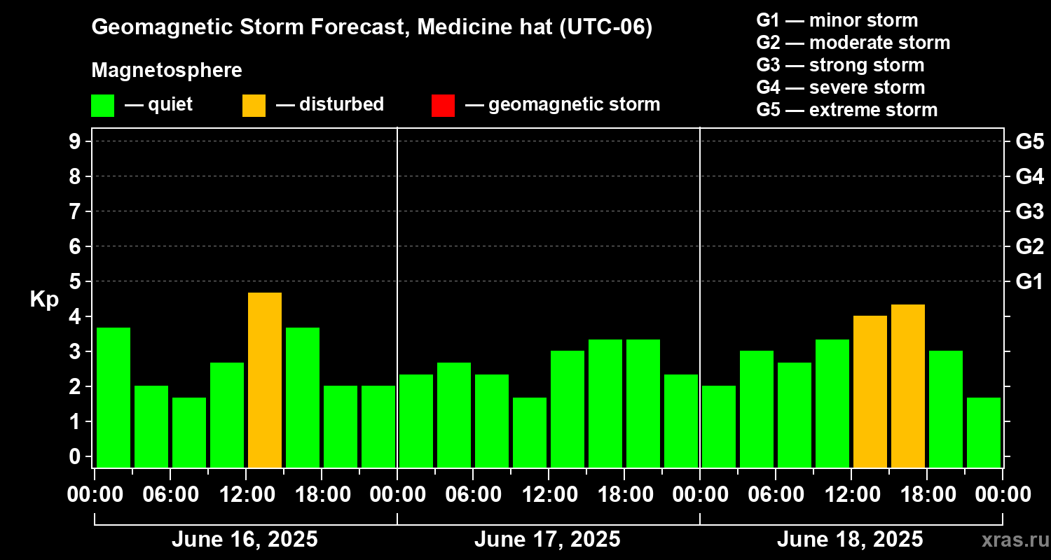 Geomagnetic storm forecast in Medicine hat for Jun 16, 2025