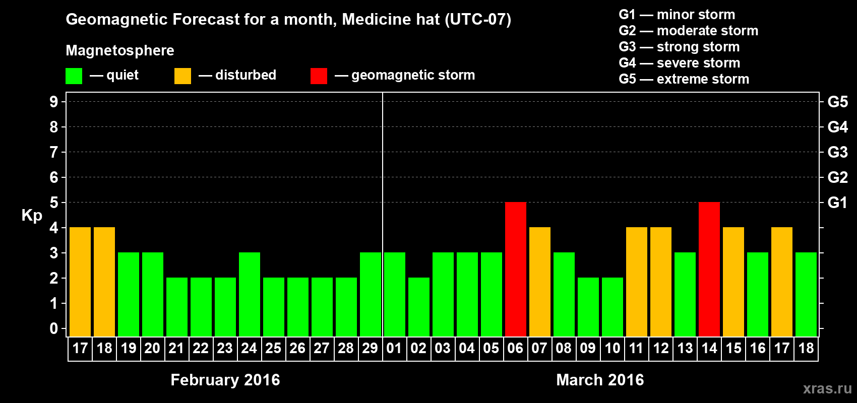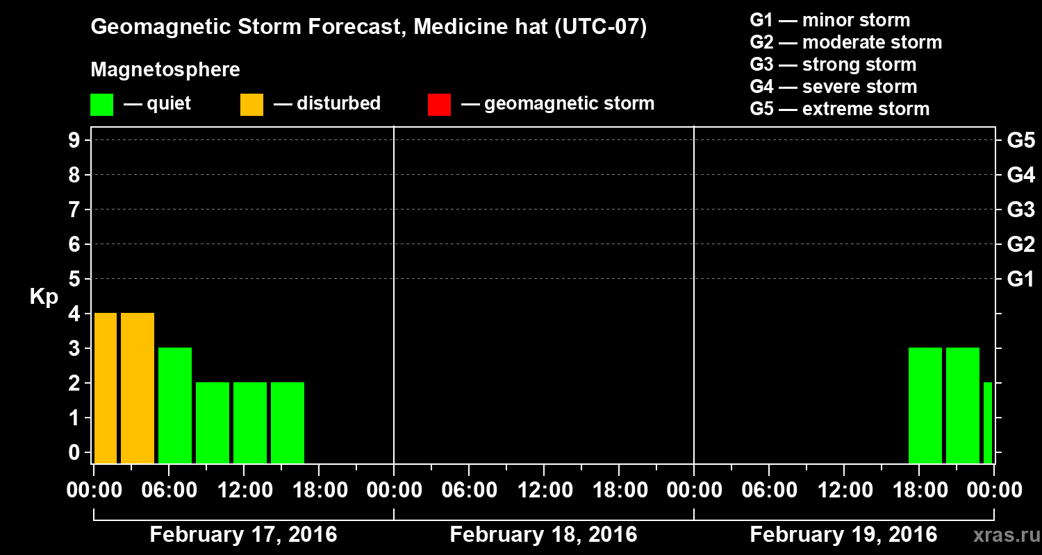 Geomagnetic storm forecast in Medicine hat for Feb 17, 2016
