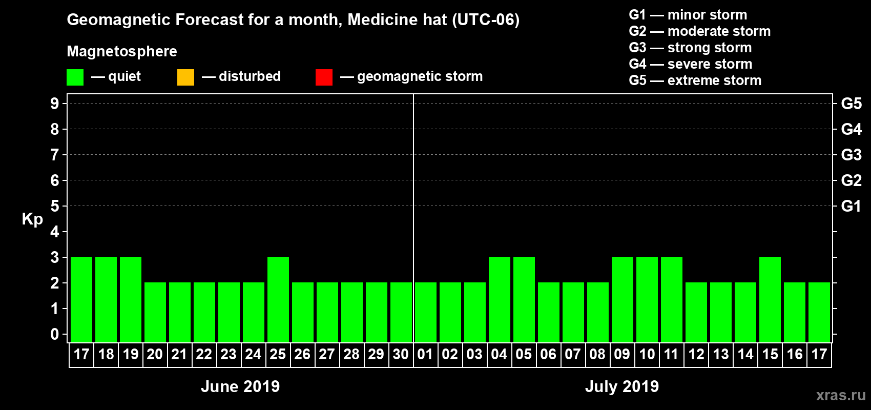 Geomagnetic storm forecast in Medicine hat for Jun 17, 2019