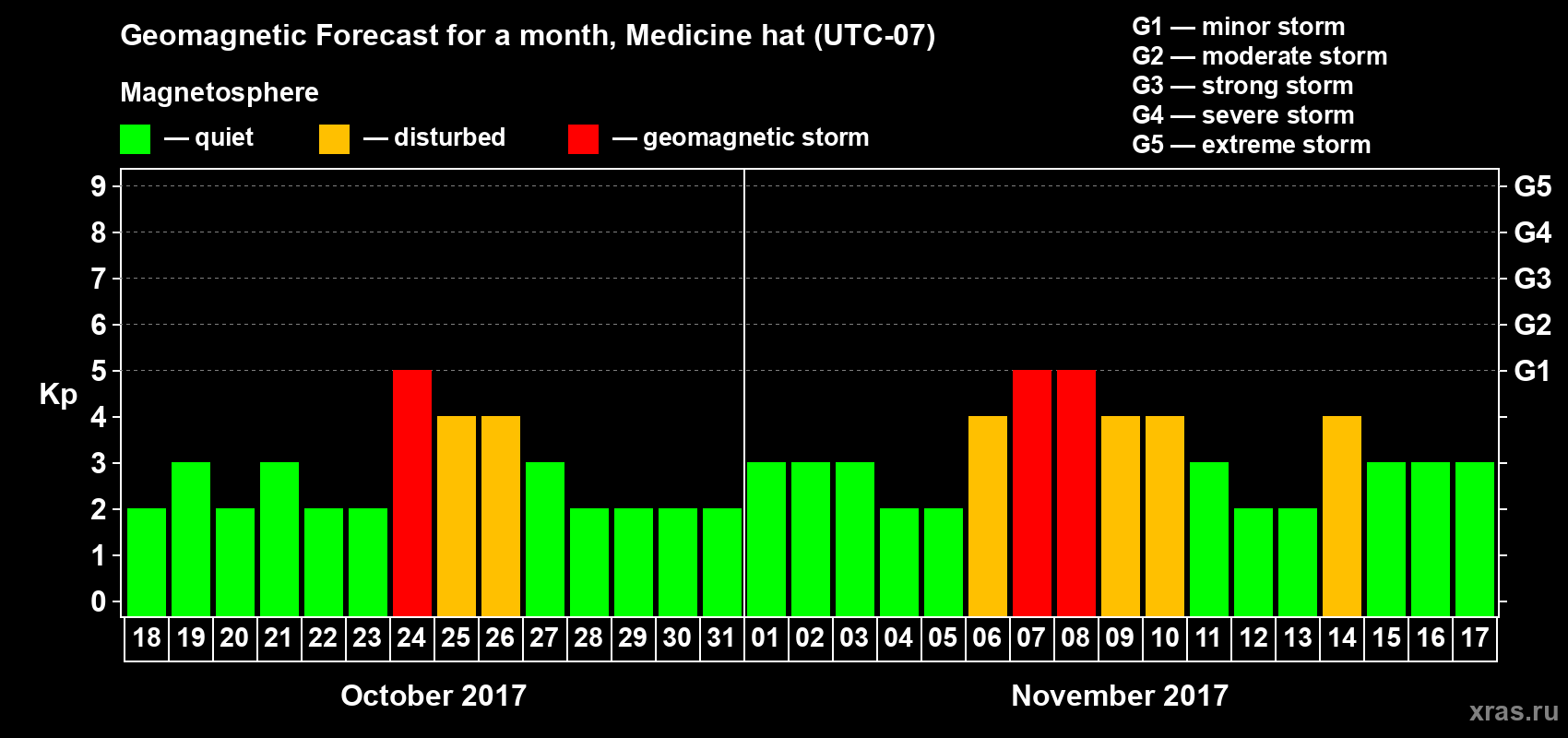 Geomagnetic storm forecast in Medicine hat for Oct 18, 2017