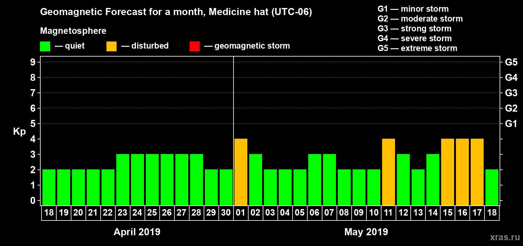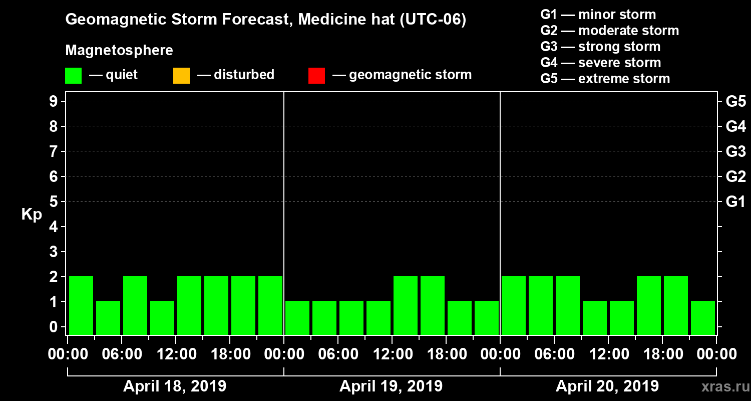 Geomagnetic storm forecast in Medicine hat for Apr 18, 2019