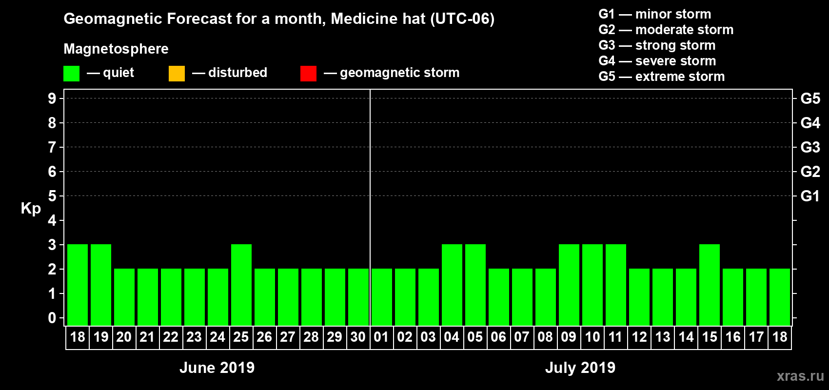 Geomagnetic storm forecast in Medicine hat for Jun 18, 2019