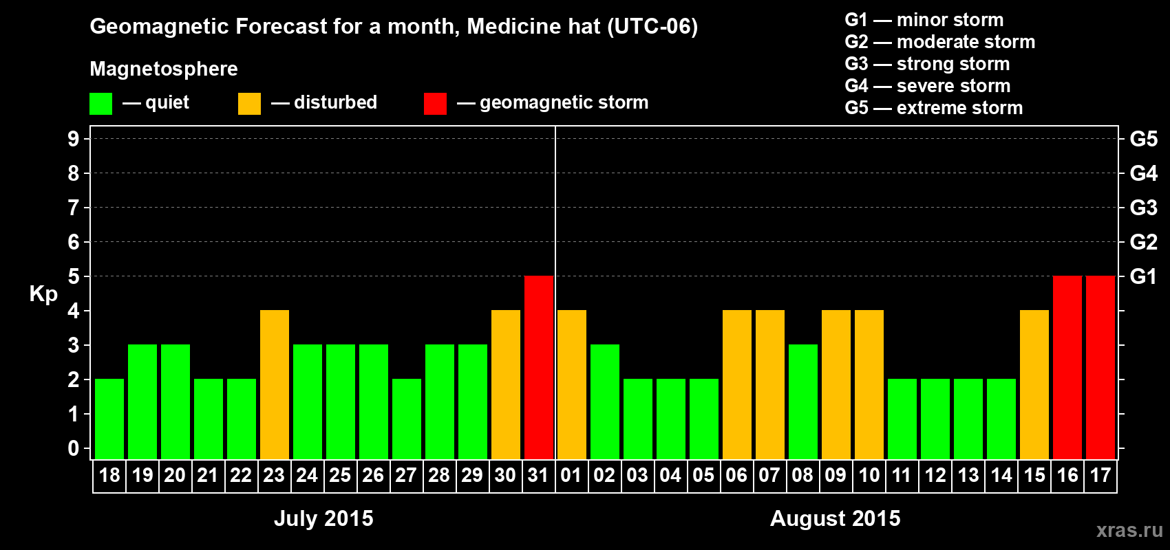 Geomagnetic storm forecast in Medicine hat for Jul 18, 2015