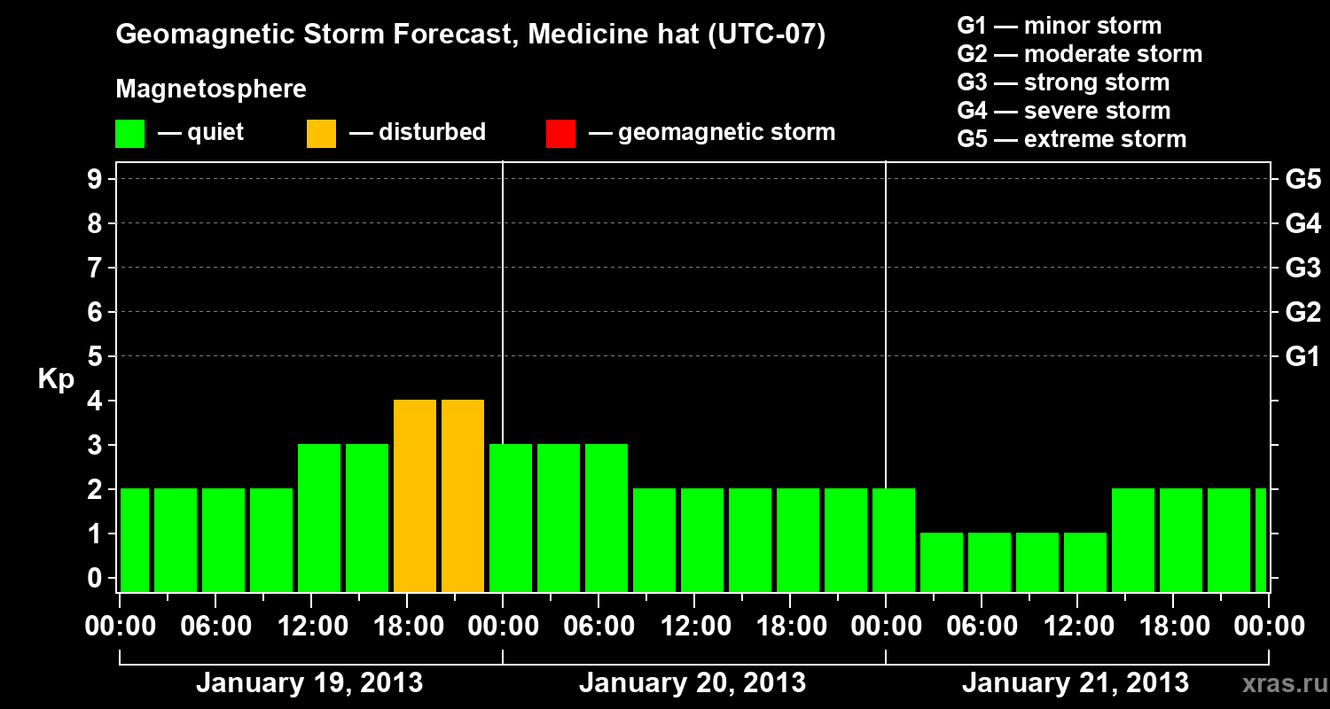 Geomagnetic storm forecast in Medicine hat for Jan 19, 2013