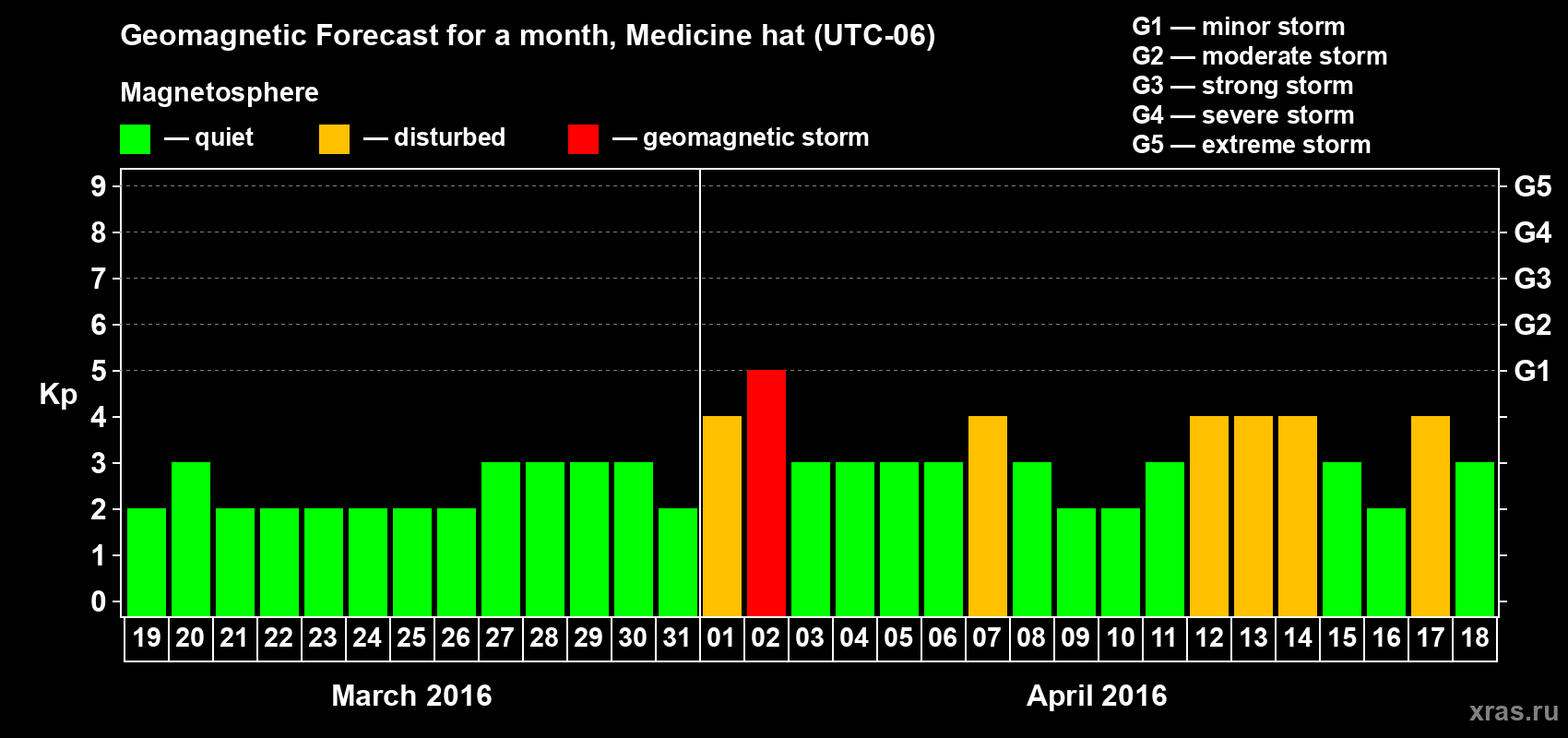 Geomagnetic storm forecast in Medicine hat for Mar 19, 2016