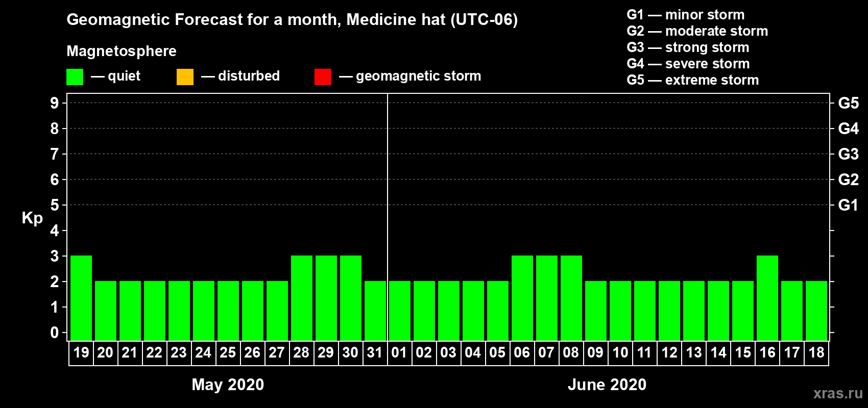 Geomagnetic storm forecast in Medicine hat for May 19, 2020