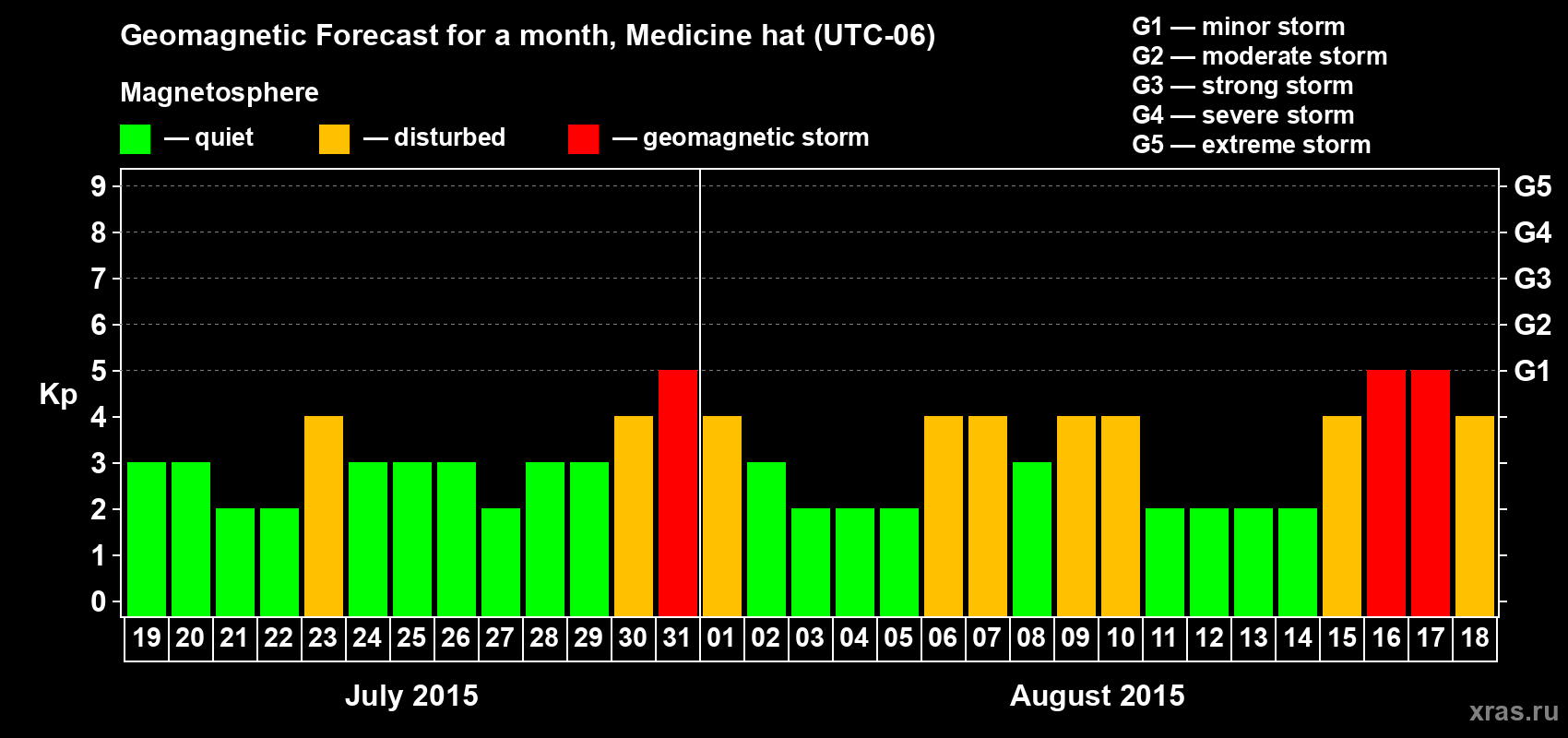 Geomagnetic storm forecast in Medicine hat for Jul 19, 2015
