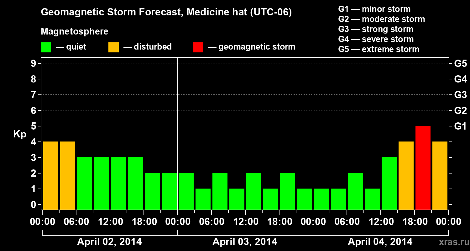 Geomagnetic storm forecast in Medicine hat for Apr 02, 2014