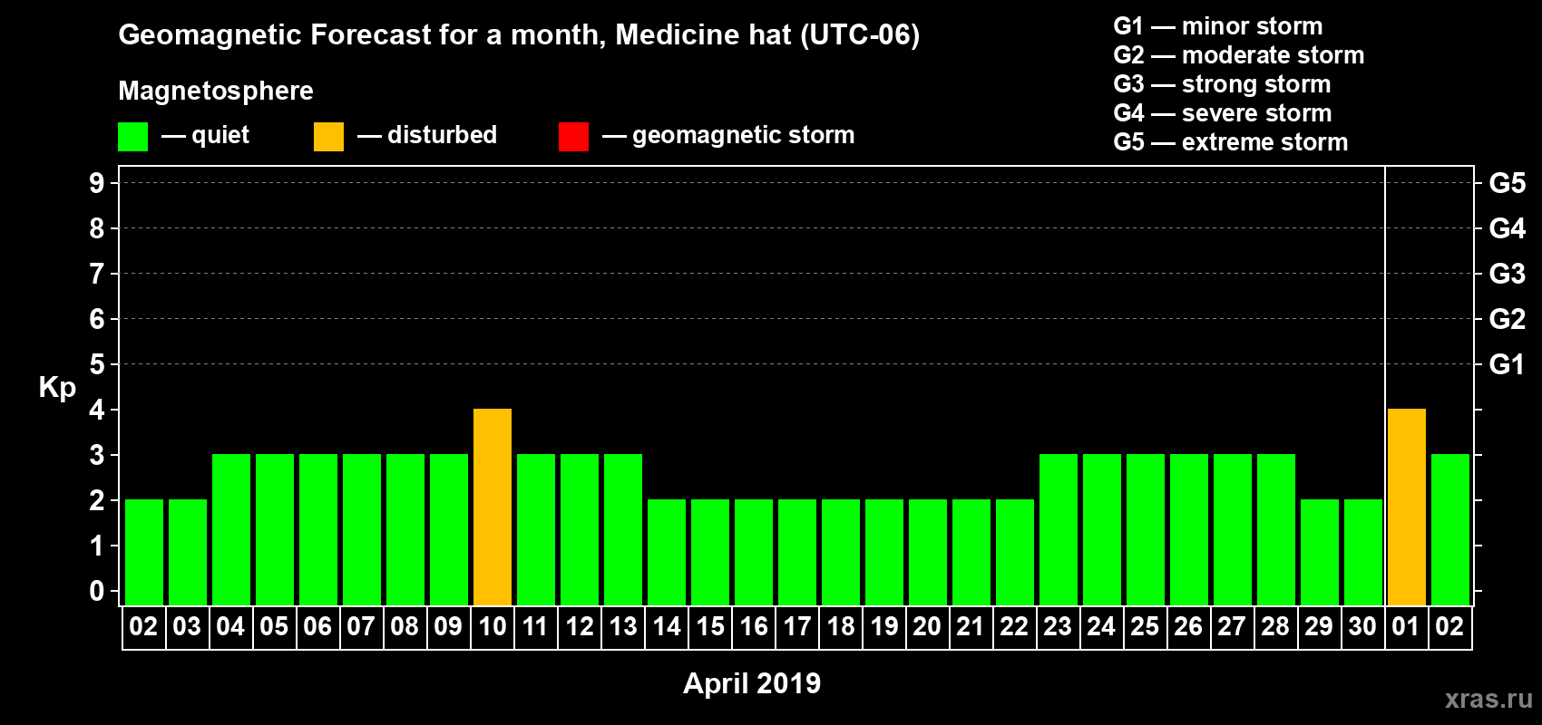 Geomagnetic storm forecast in Medicine hat for Apr 02, 2019