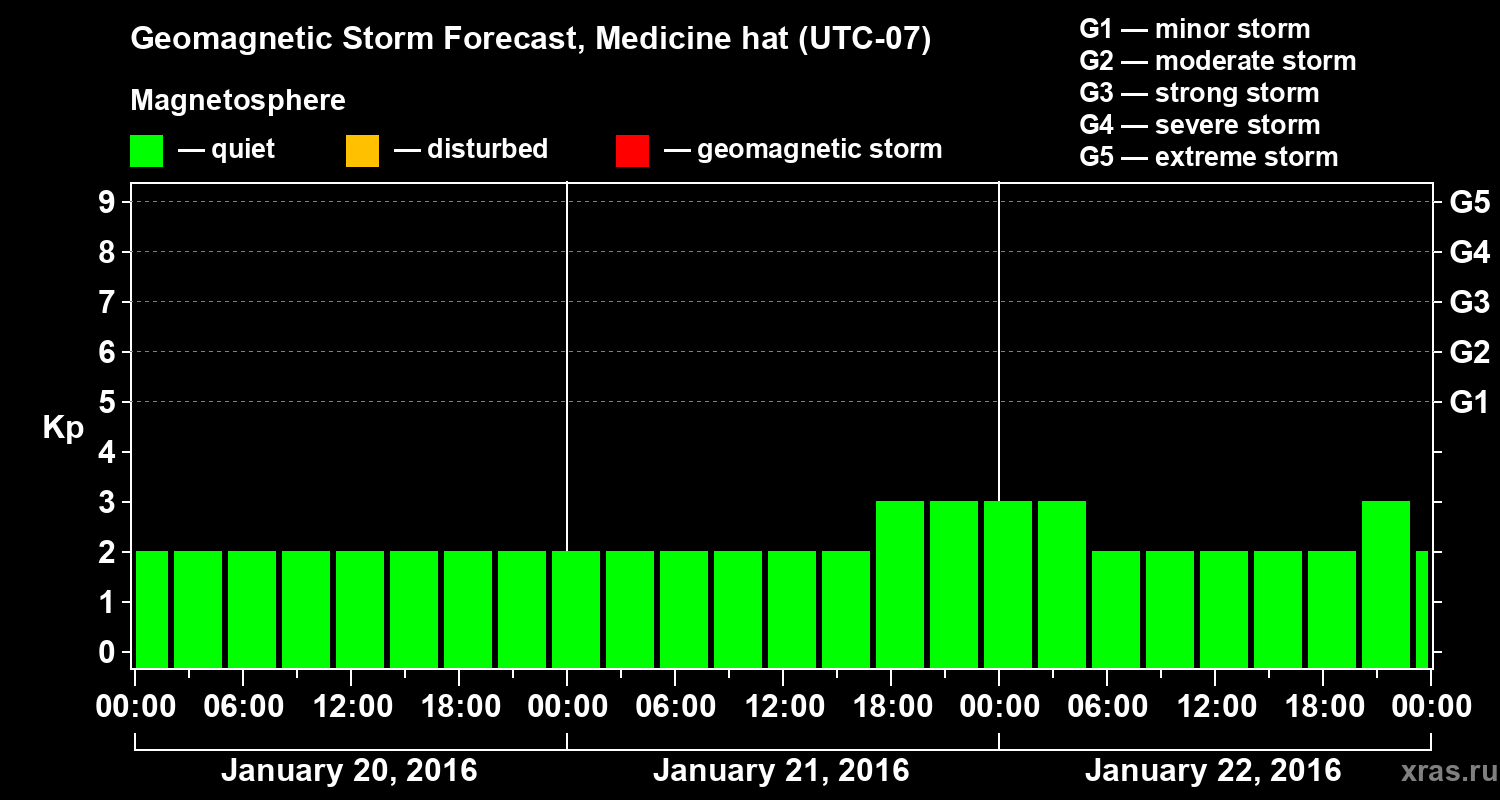 Geomagnetic storm forecast in Medicine hat for Jan 20, 2016