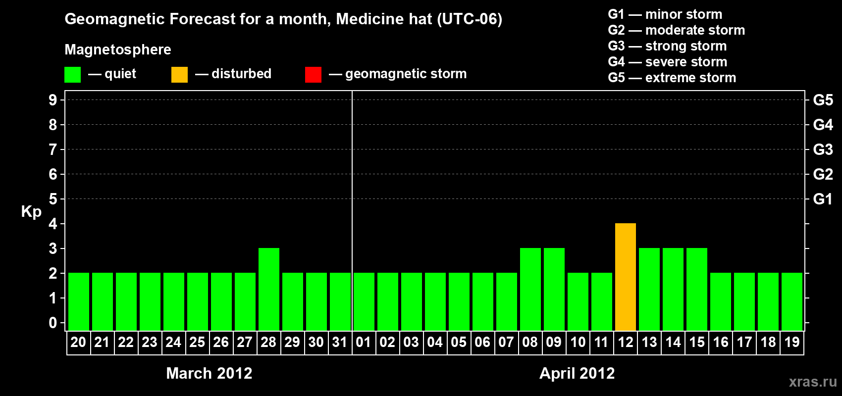 Geomagnetic storm forecast in Medicine hat for Mar 20, 2012