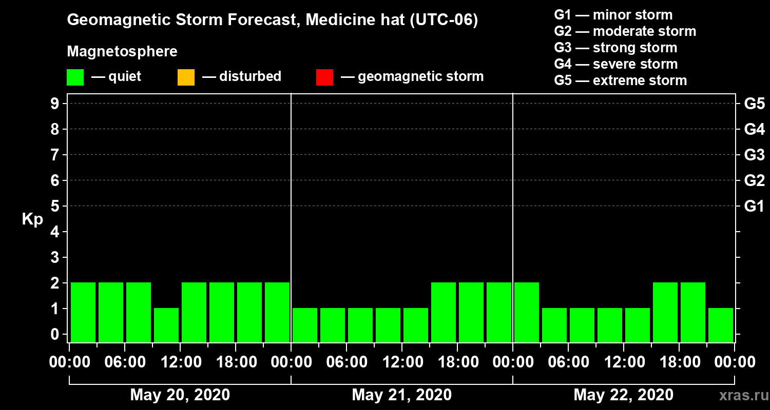 Geomagnetic storm forecast in Medicine hat for May 20, 2020