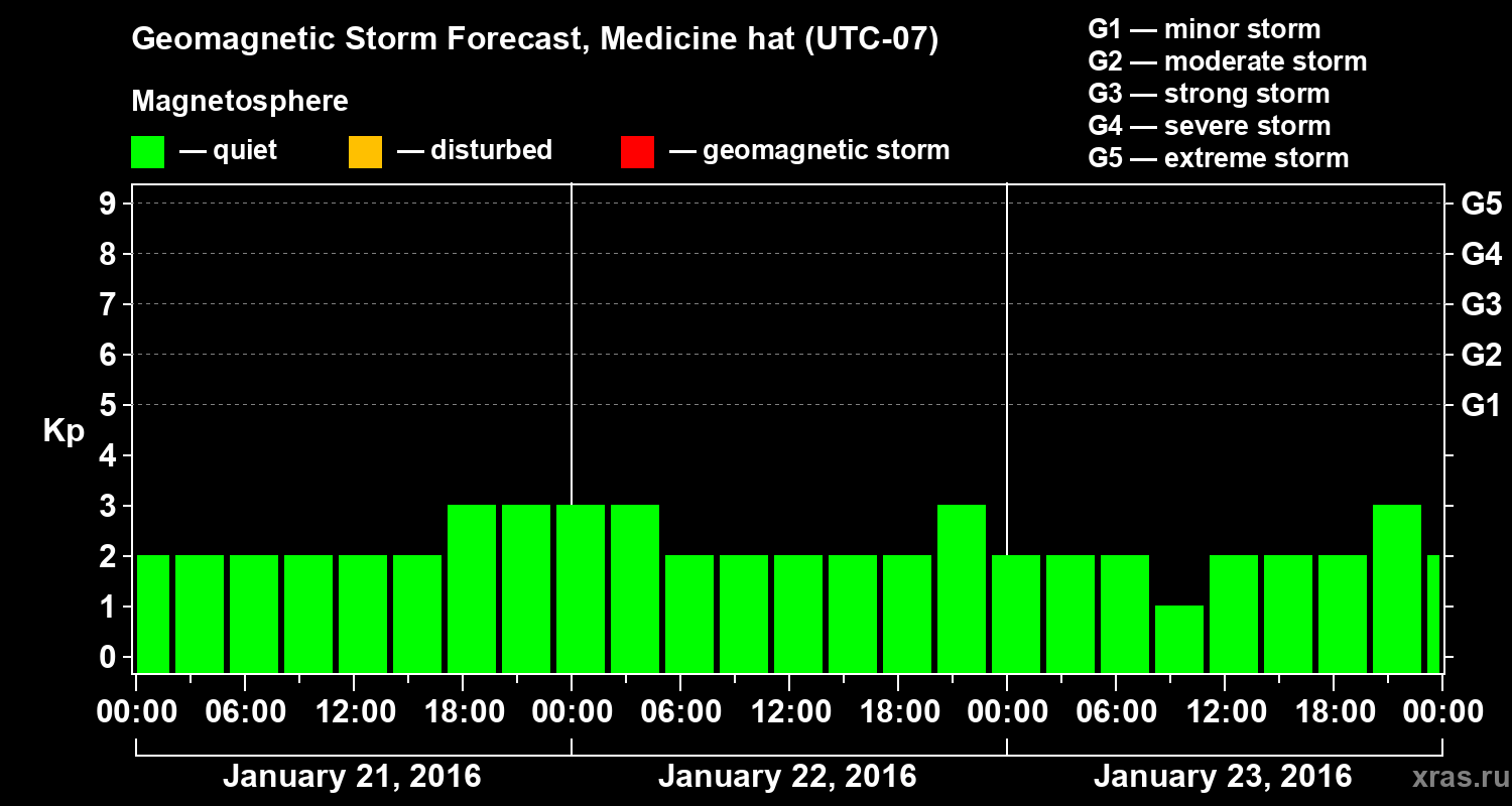 Geomagnetic storm forecast in Medicine hat for Jan 21, 2016