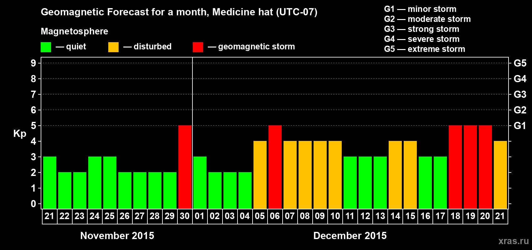Geomagnetic storm forecast in Medicine hat for Nov 21, 2015