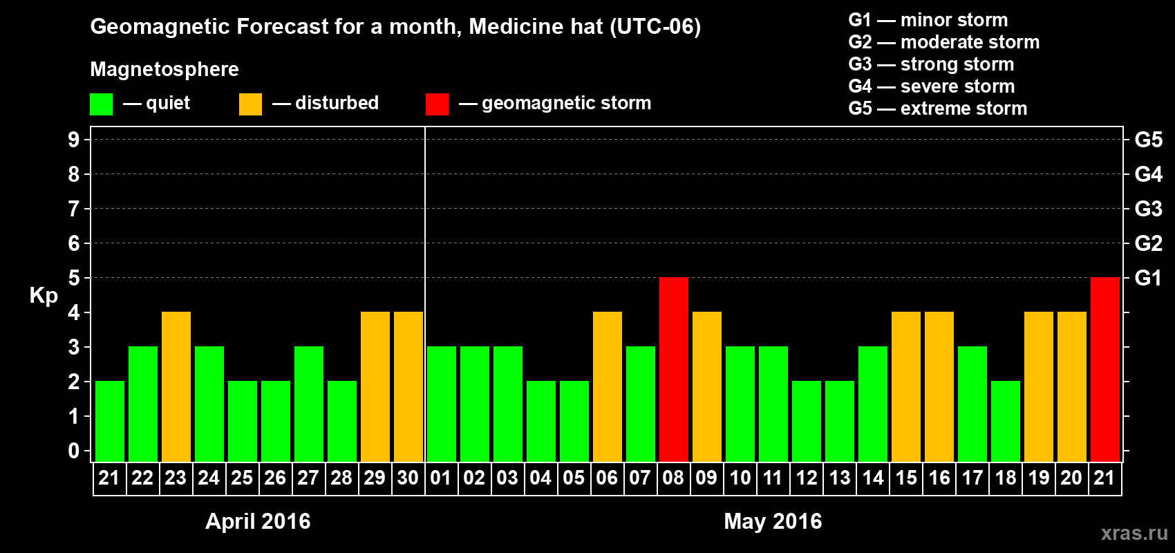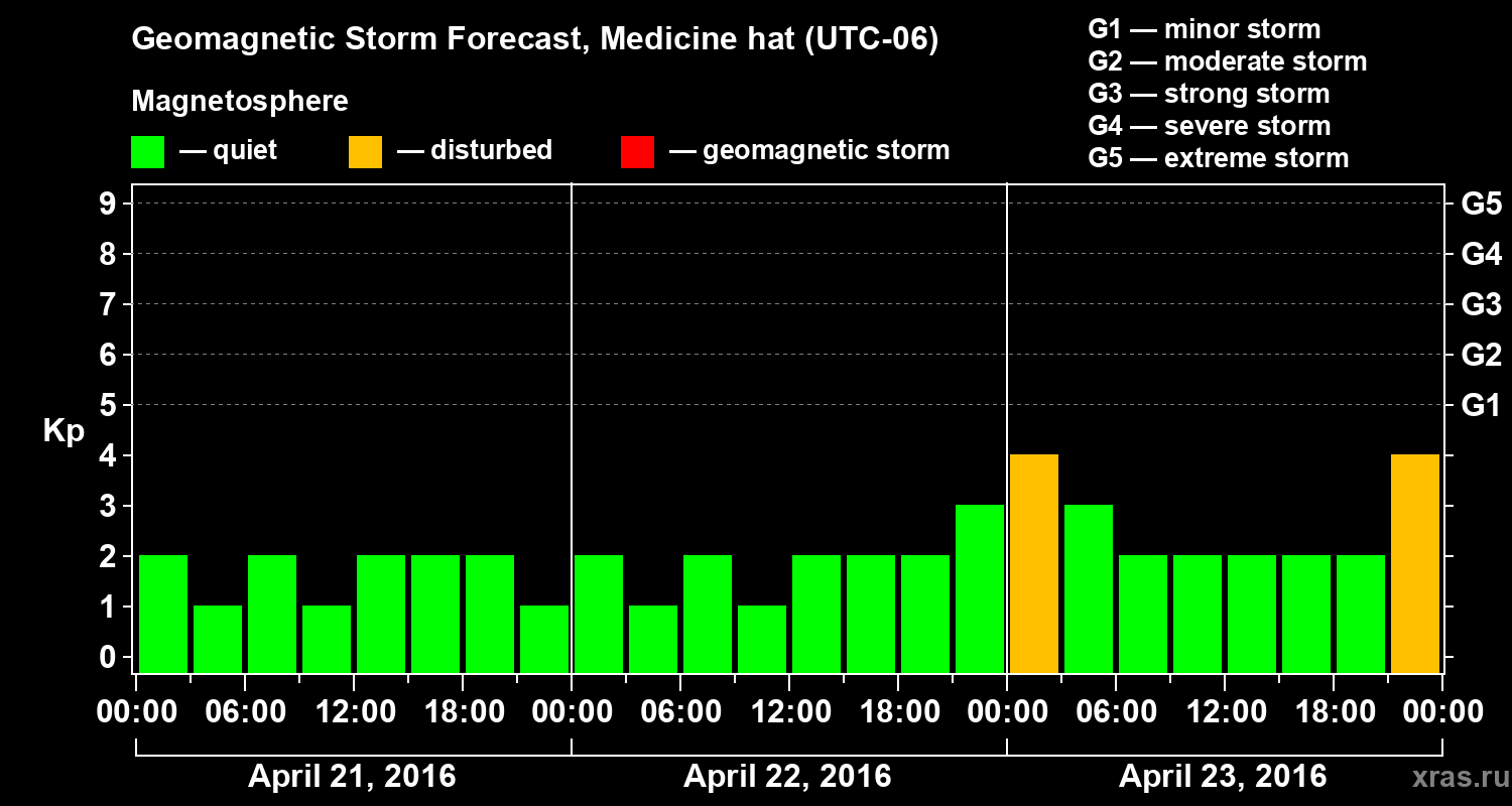 Geomagnetic storm forecast in Medicine hat for Apr 21, 2016