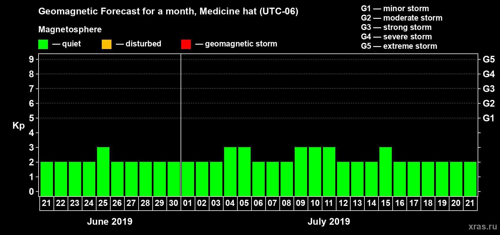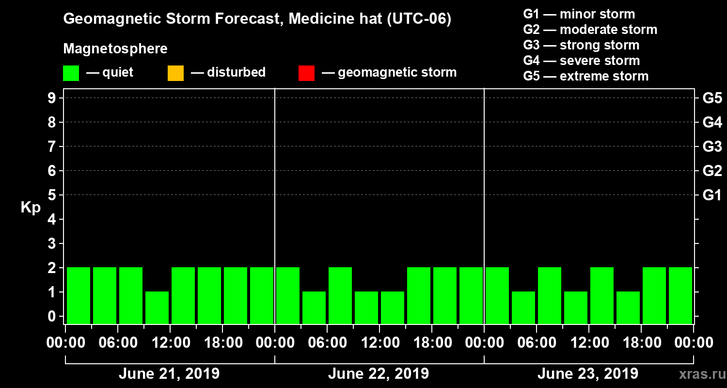 Geomagnetic storm forecast in Medicine hat for Jun 21, 2019