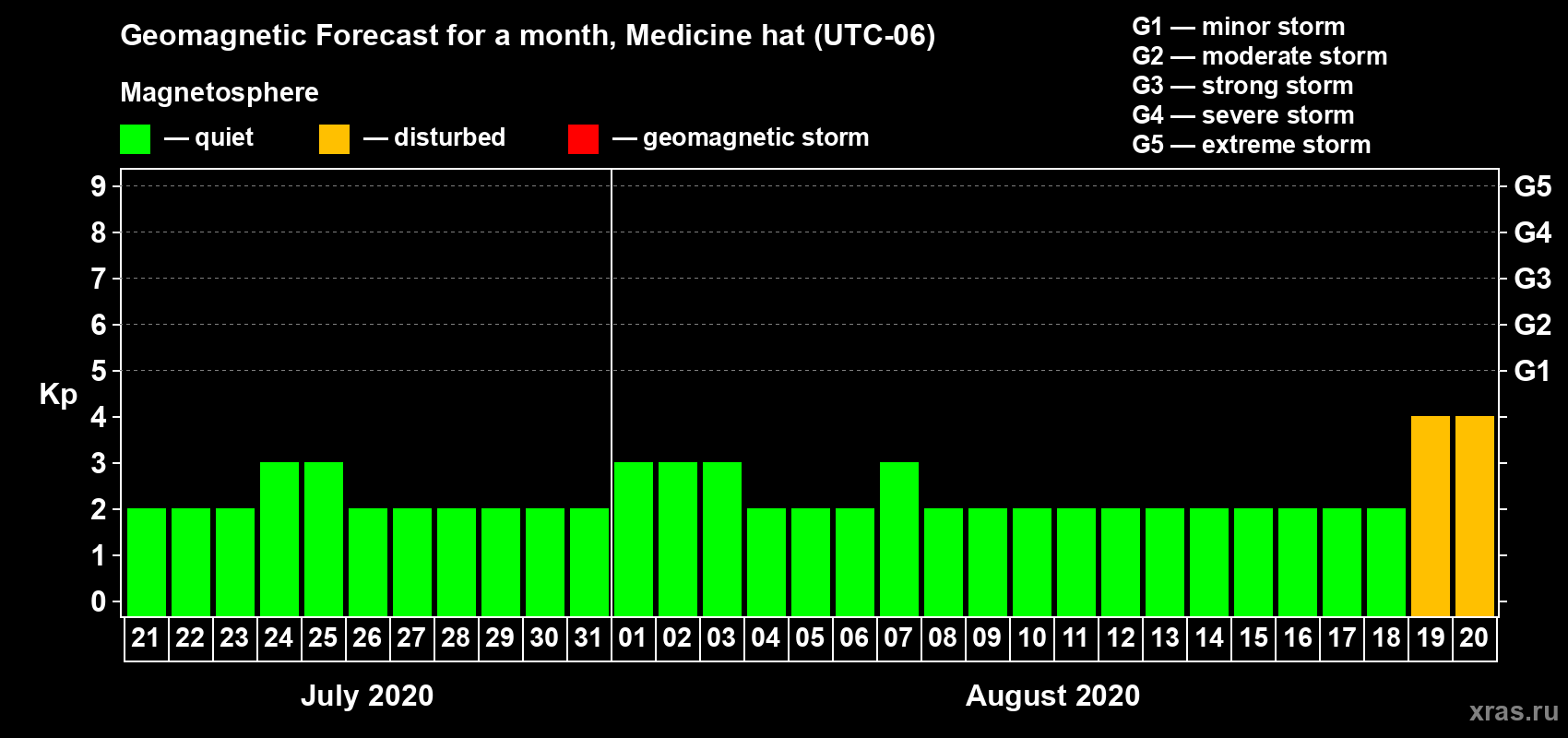 Geomagnetic storm forecast in Medicine hat for Jul 21, 2020