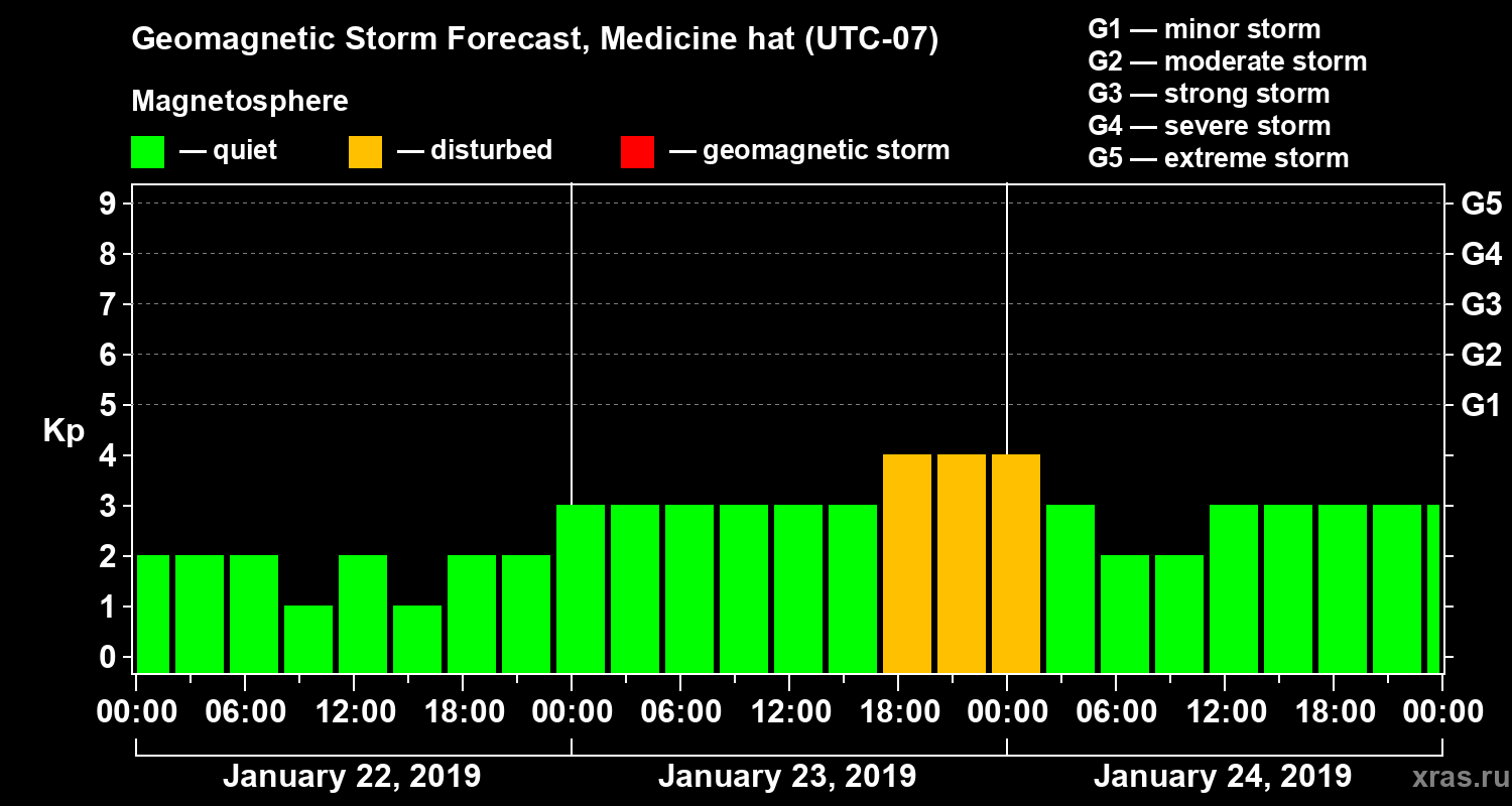 Geomagnetic storm forecast in Medicine hat for Jan 22, 2019
