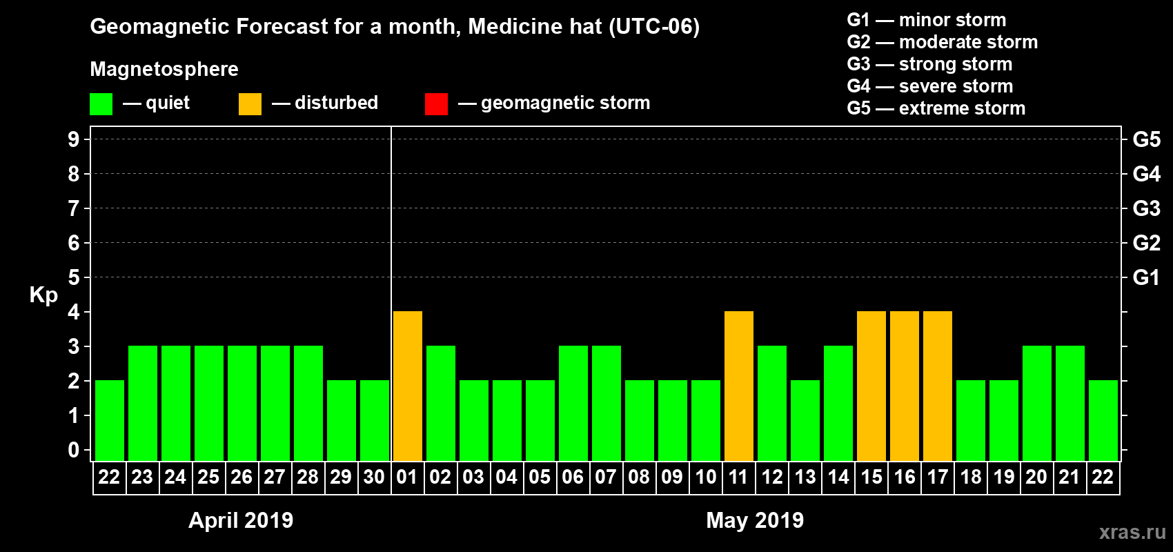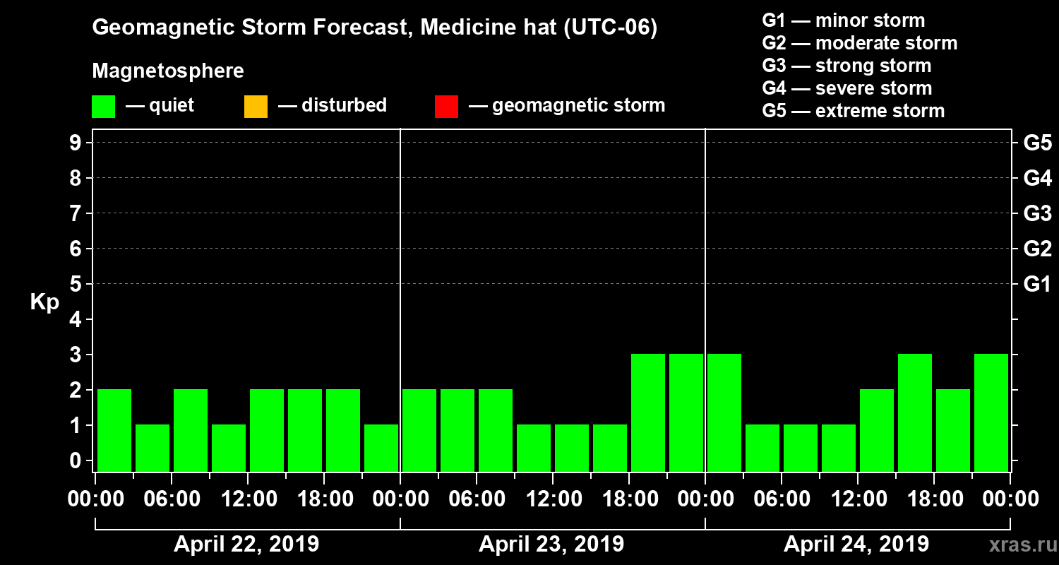 Geomagnetic storm forecast in Medicine hat for Apr 22, 2019