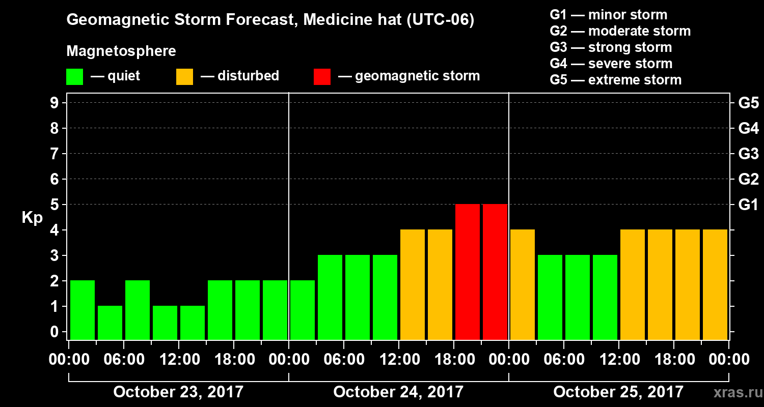 Geomagnetic storm forecast in Medicine hat for Oct 23, 2017