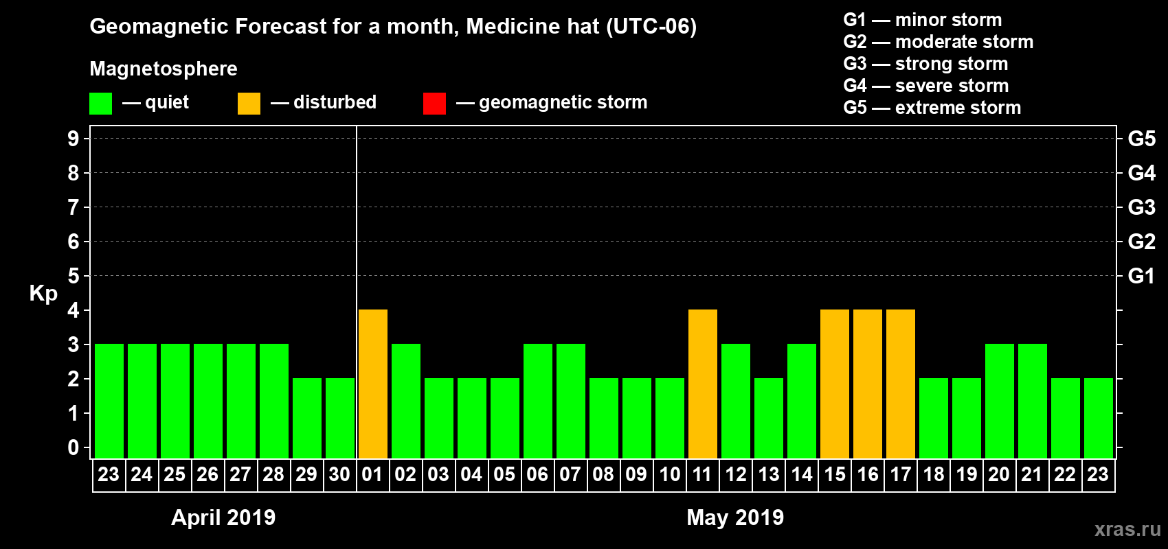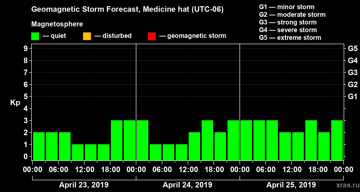 Geomagnetic storm forecast in Medicine hat for Apr 23, 2019