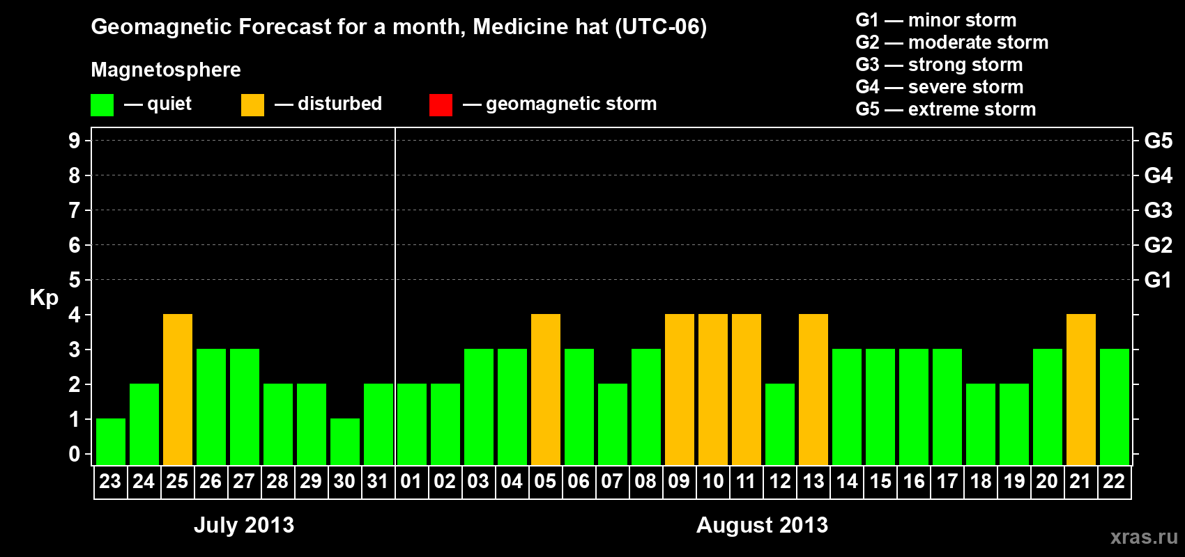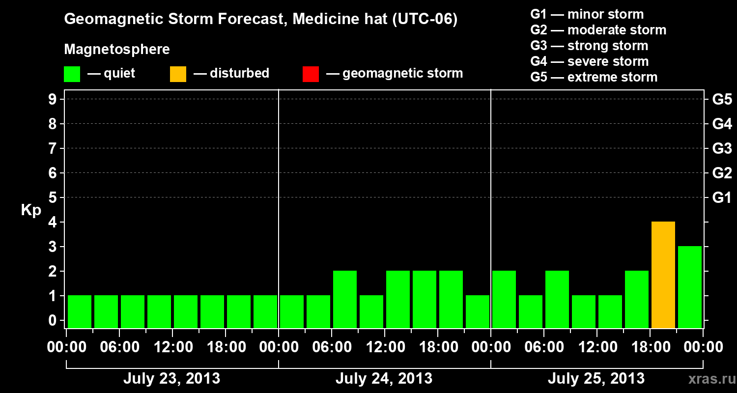 Geomagnetic storm forecast in Medicine hat for Jul 23, 2013